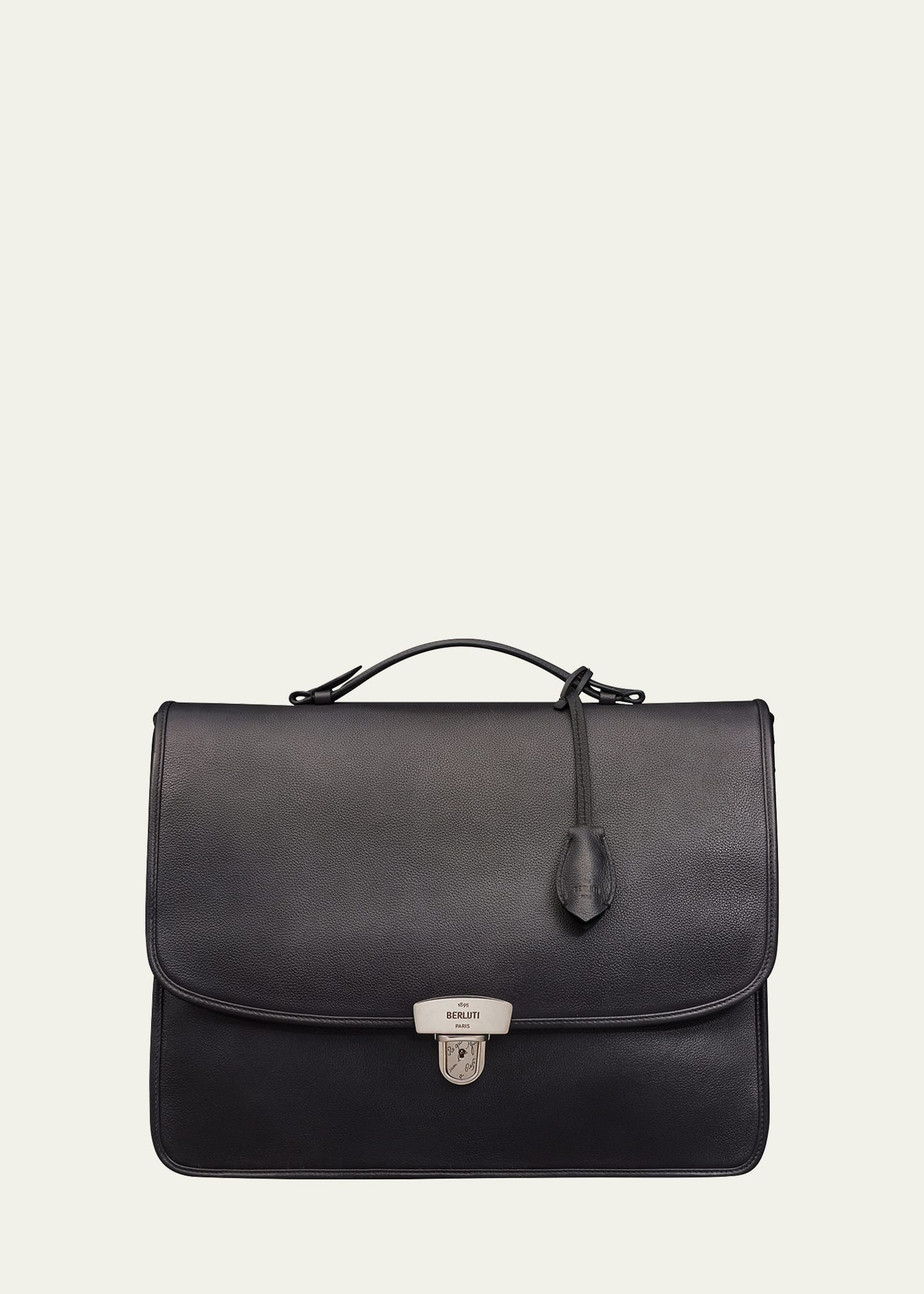 Berluti briefcase in Venezia leather Two rolled top carry handles Two main zip compartments Exterior, one zip pocket, trolley sleeve Interior, one zip pocket, one slip pocket, one laptop compartment Debossed logo Can be carried by hand or on the shoulder Cotton/linen lining Approx. 12"H x 16.5"W x 4"D Made in Italy