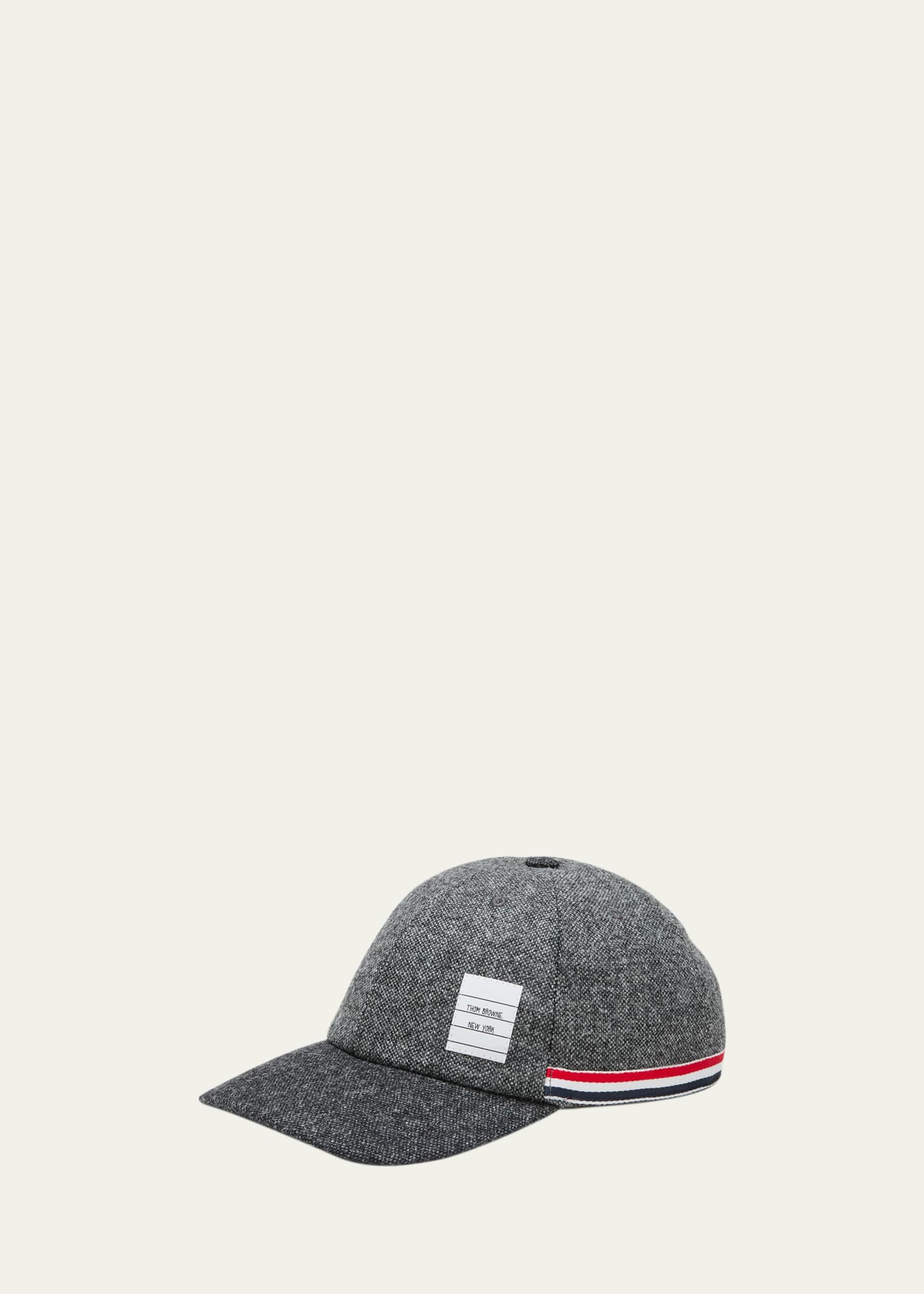 Thom Browne baseball cap features a name tag logo appliqué at front Signature striped grosgrain trim through base Top button at crown Six-panel construction Curved stitched brim Adjustable strap at back Wool/cotton Made in Italy