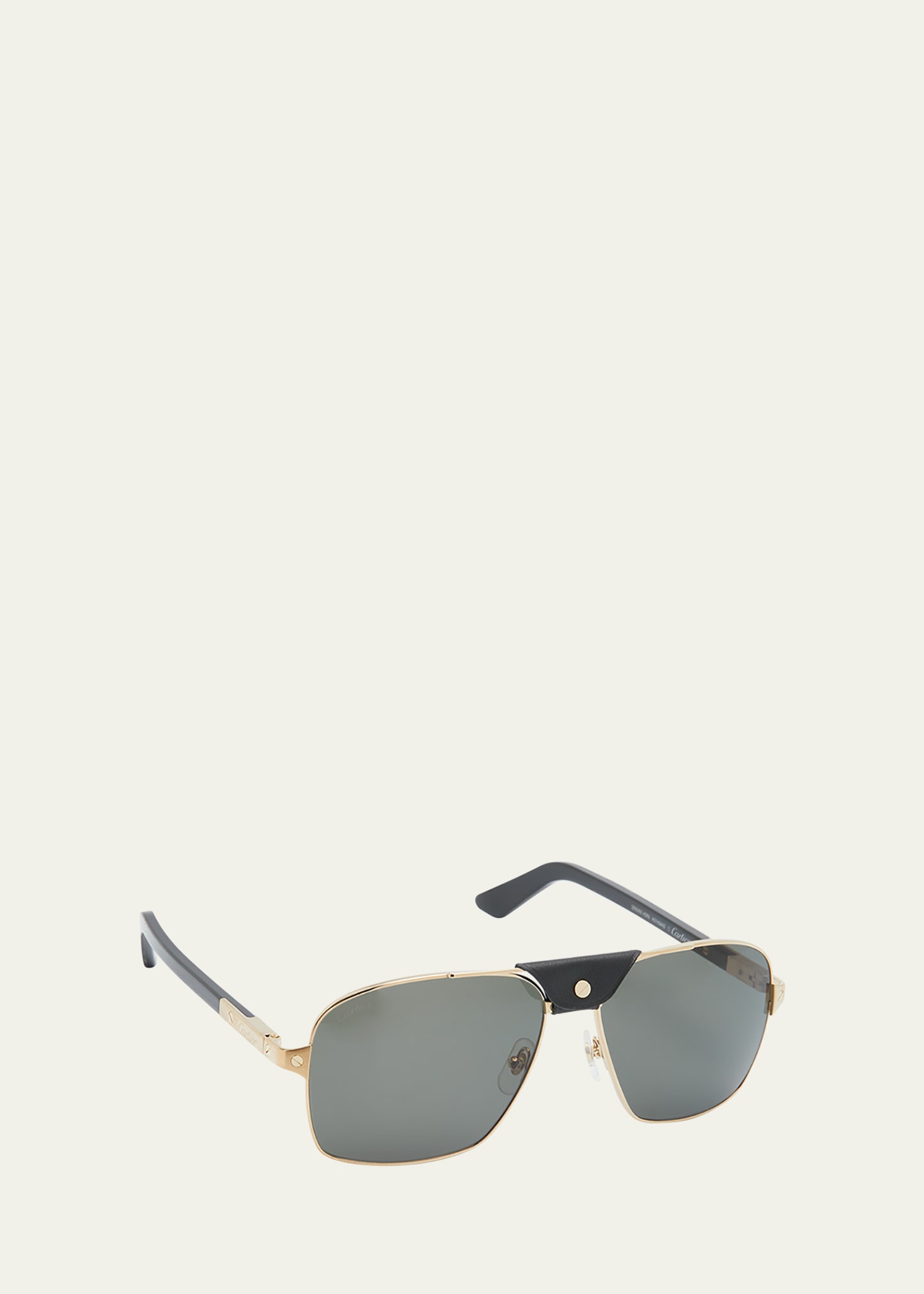 Cartier "CT0389SM" aviator sunglasses made from injection plastic features logo detail at the temple Eye/bridge/temple (in mm): 57-16-145 Solid-colored lenses; etched logo Thin, full-rim frames Double nose bridge; leather cover with snap button Adjustable nose pads Tapered arms; curved temple tips Injection plastic 100% UVA/UVB protection Made in Italy