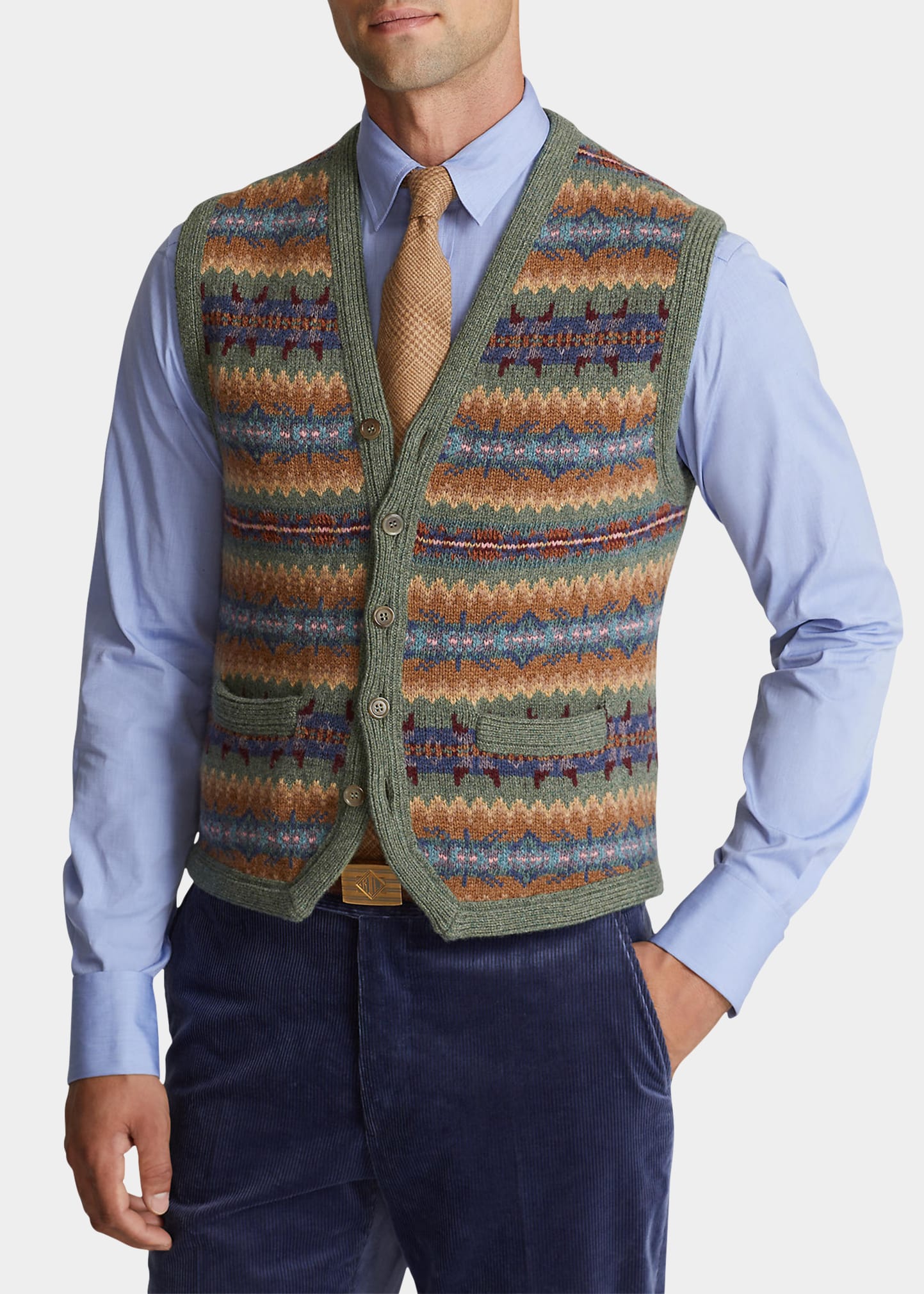 Ralph Lauren Home jacquard cardigan vest inspired by vintage Fair Isle sweaters V-Neck Button front closure Sleeveless Wool/cashmere Made in Italy