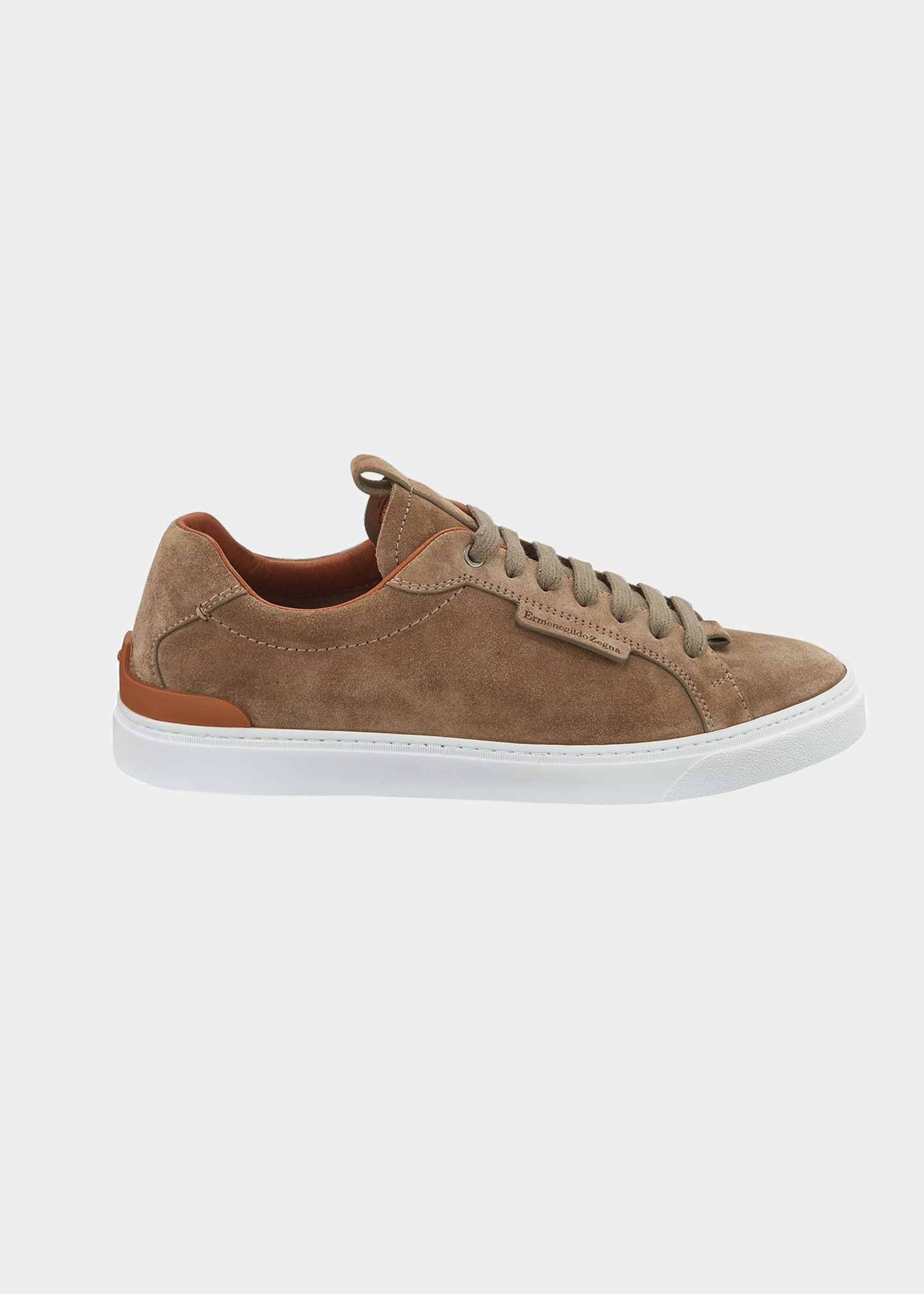 ZEGNA "Ferrara" low-top sneaker in calf suede Flat heel; contrast heel guard Round toe Lace-up vamp Pull-tab at tongue Logo tag at side Padded collar Rubber sole Made in Italy