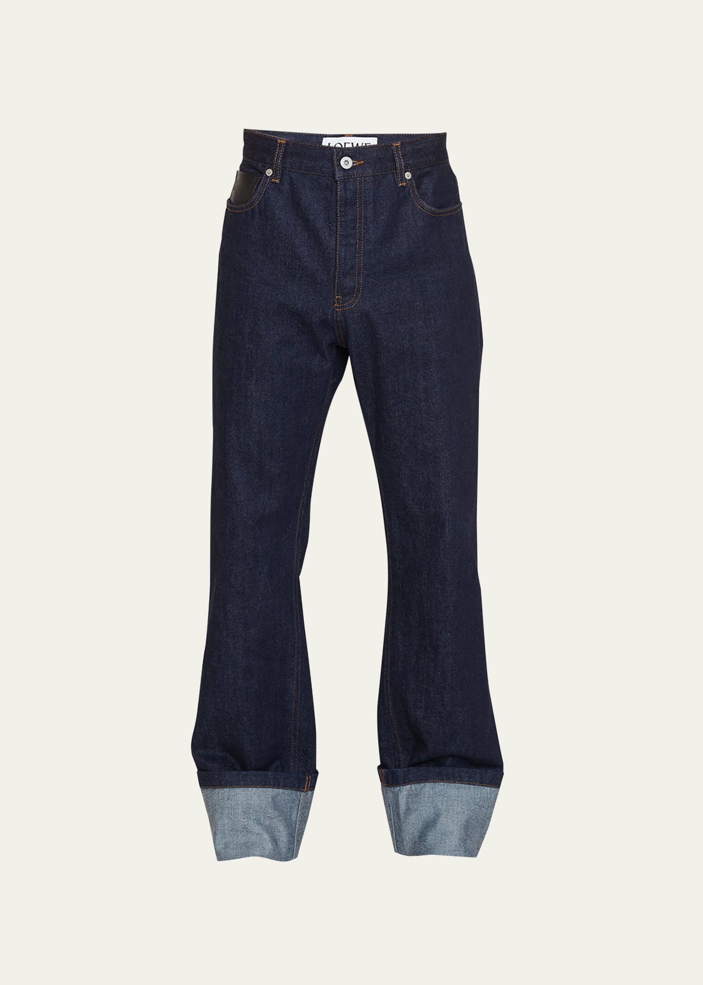 Loewe "Fisherman" jeans with exaggerated turn-up hems Regular rise Five pocket style with leather detail Full length Straight legs Button closure/zip fly; belt loops Cotton/calf leather Made in Italy