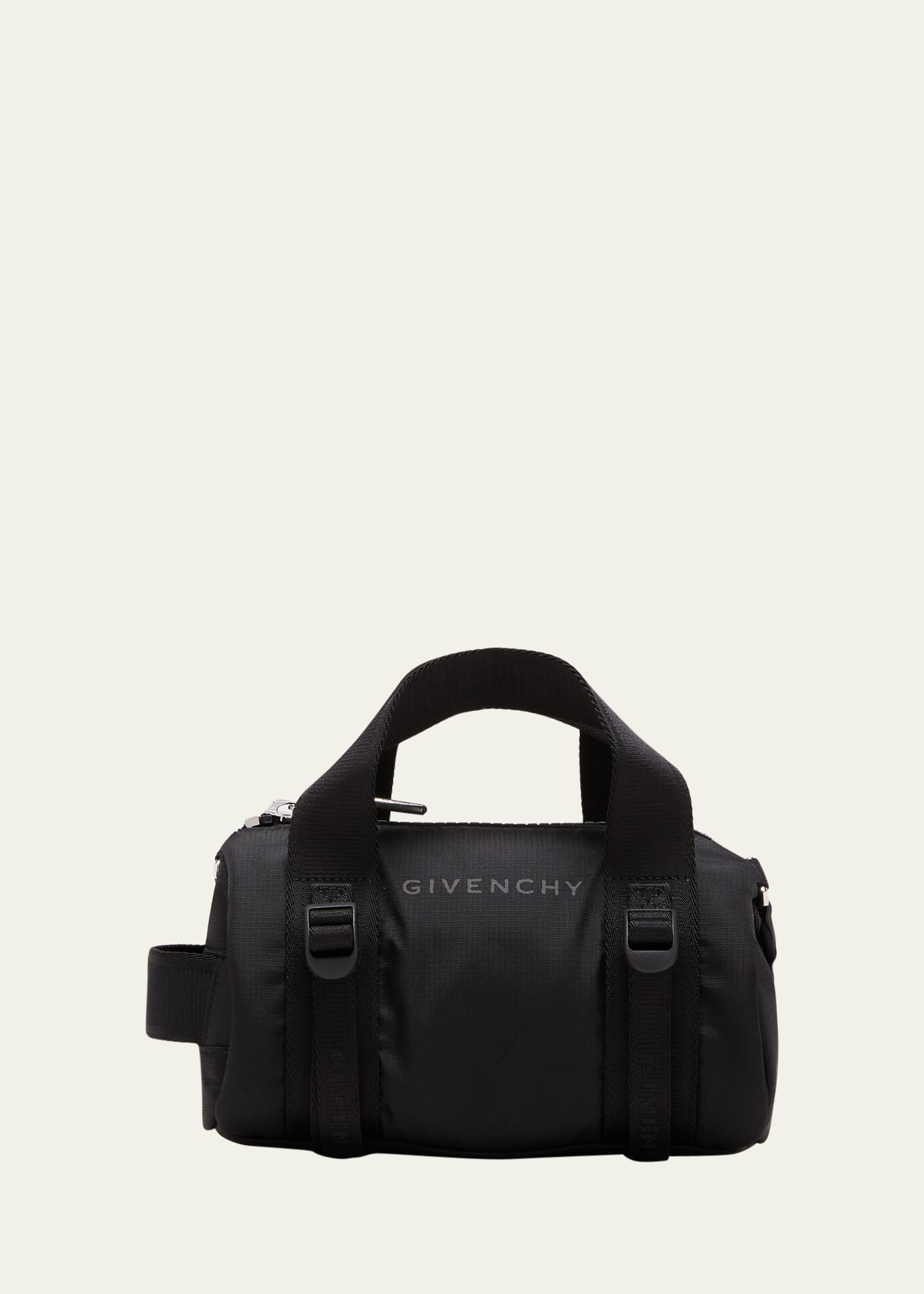 Givenchy crossbody bag in amni® nylon and leather from the G-Trek line Mini duffel bag design Adjustable crossbody strap Two top carry handles 4G zip closure Reflective logo and buckles at front Approx. 5.1"H x 7.87"W x 3.5"D Made in Italy