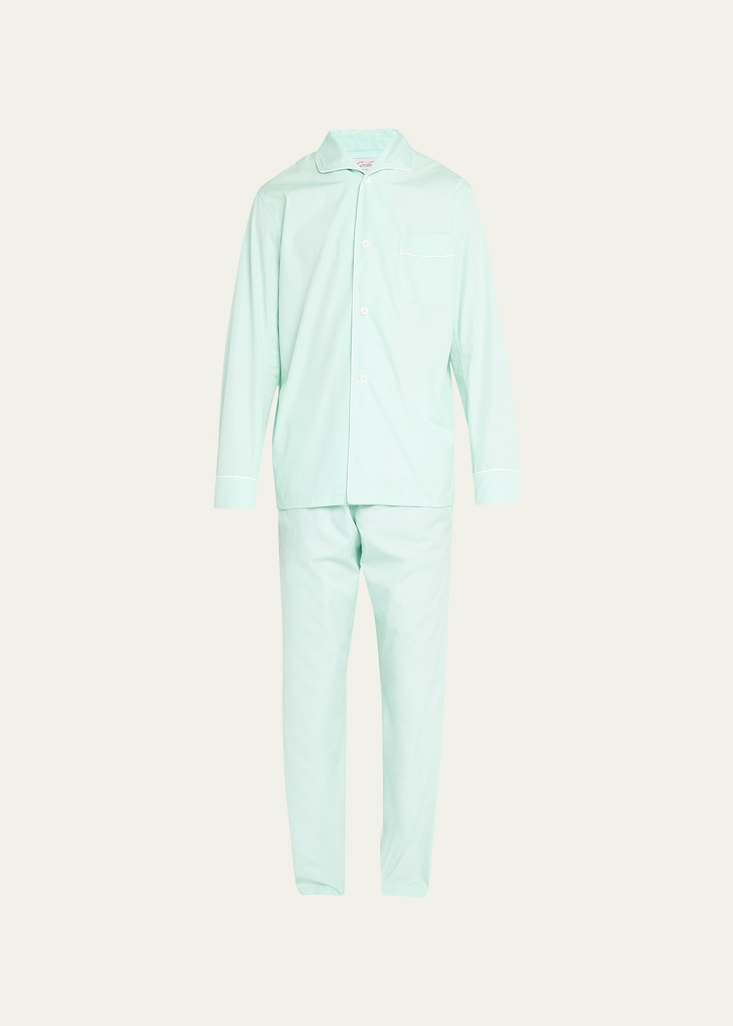 Anderson & Sheppard "George Cortina" men's matching two-piece long pajama set Relaxed fit Organic cotton Made in Italy & ZeroWidthSpace; Pajama Shirt: Features contrast piping Approx. 25.5" from shoulder to hem Rounded collar; button placket Chest patch pocket Long sleeves; approx. 21.3"L Pajama Pants: Elasticized waistband Button-fly Straight legs Full length