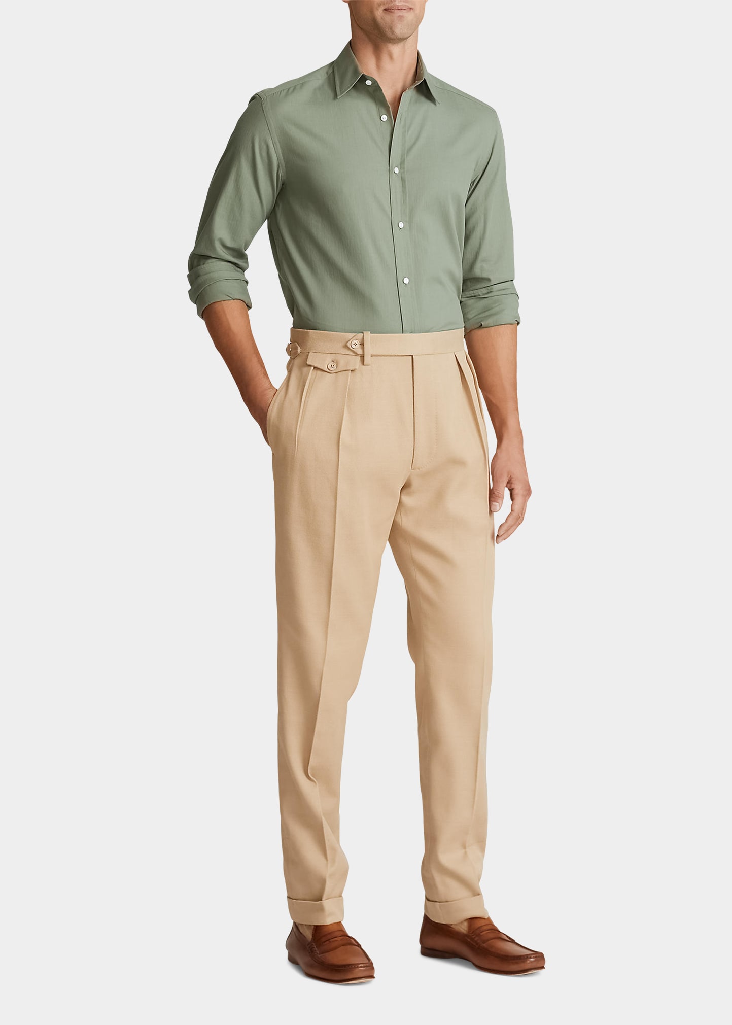 Ralph Lauren Home "Gregory" trousers with a custom-developed fabric inspired by the vintage cavalry twills from England Curtain waistband Side adjusters Double pleated front Zip fly with an extended buttoned closure Ticket pocket at right hip Side on-seam pockets Two back buttoned pockets Full length Straight legs Cotton/wool Lining: Viscose Made in Italy