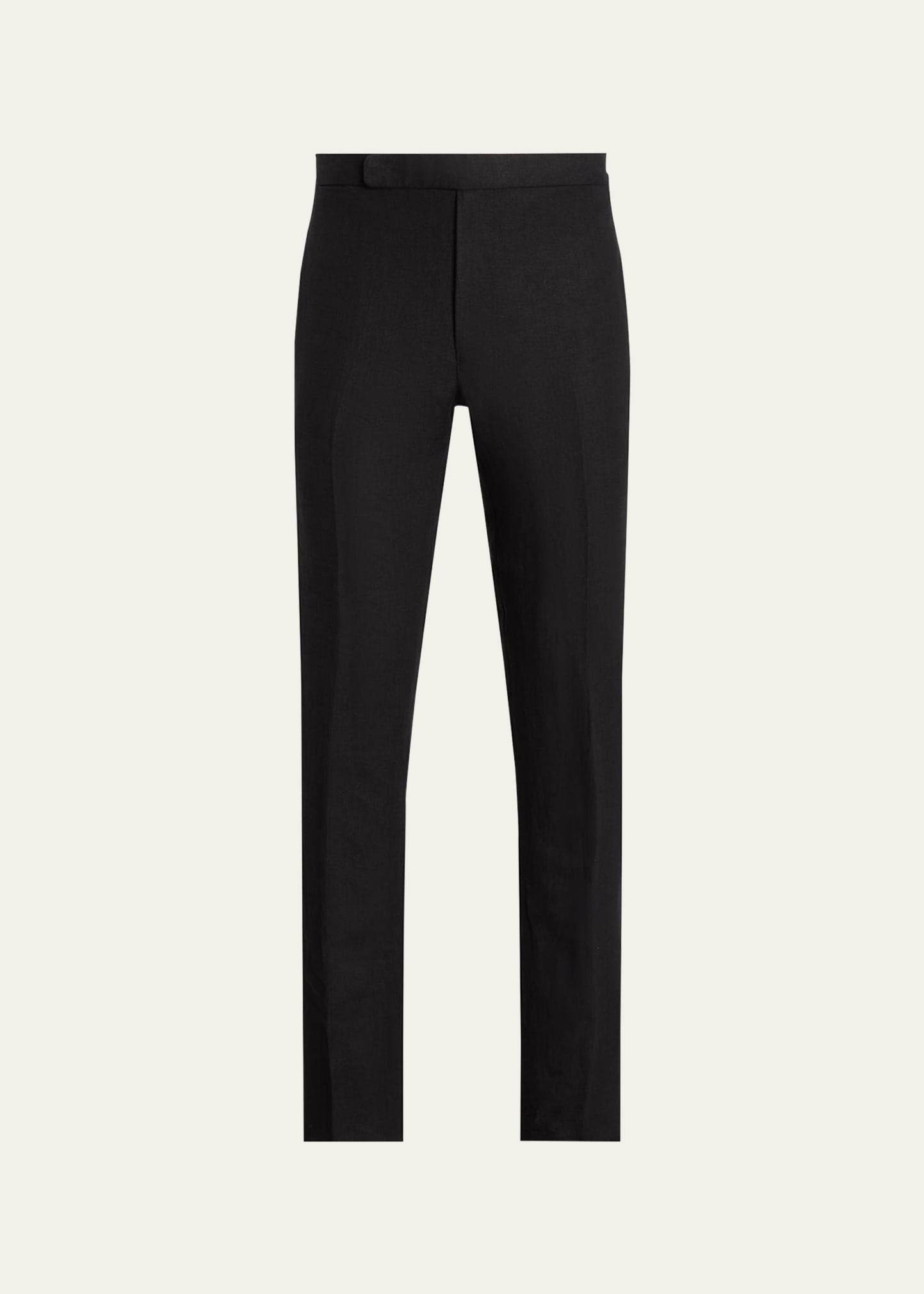 Ralph Lauren Purple Label "Gregory" hand-tailored tuxedo pants Crafted of lightweight linen fabric that was developed exclusively for Purple Label Approx. measurements: 9.0" rise; 38.25" inseam Side fasteners Side seam pockets Buttoned welt pockets at back Full length Straight legs Hook closure Lining: Viscose Dry clean Made in Italy