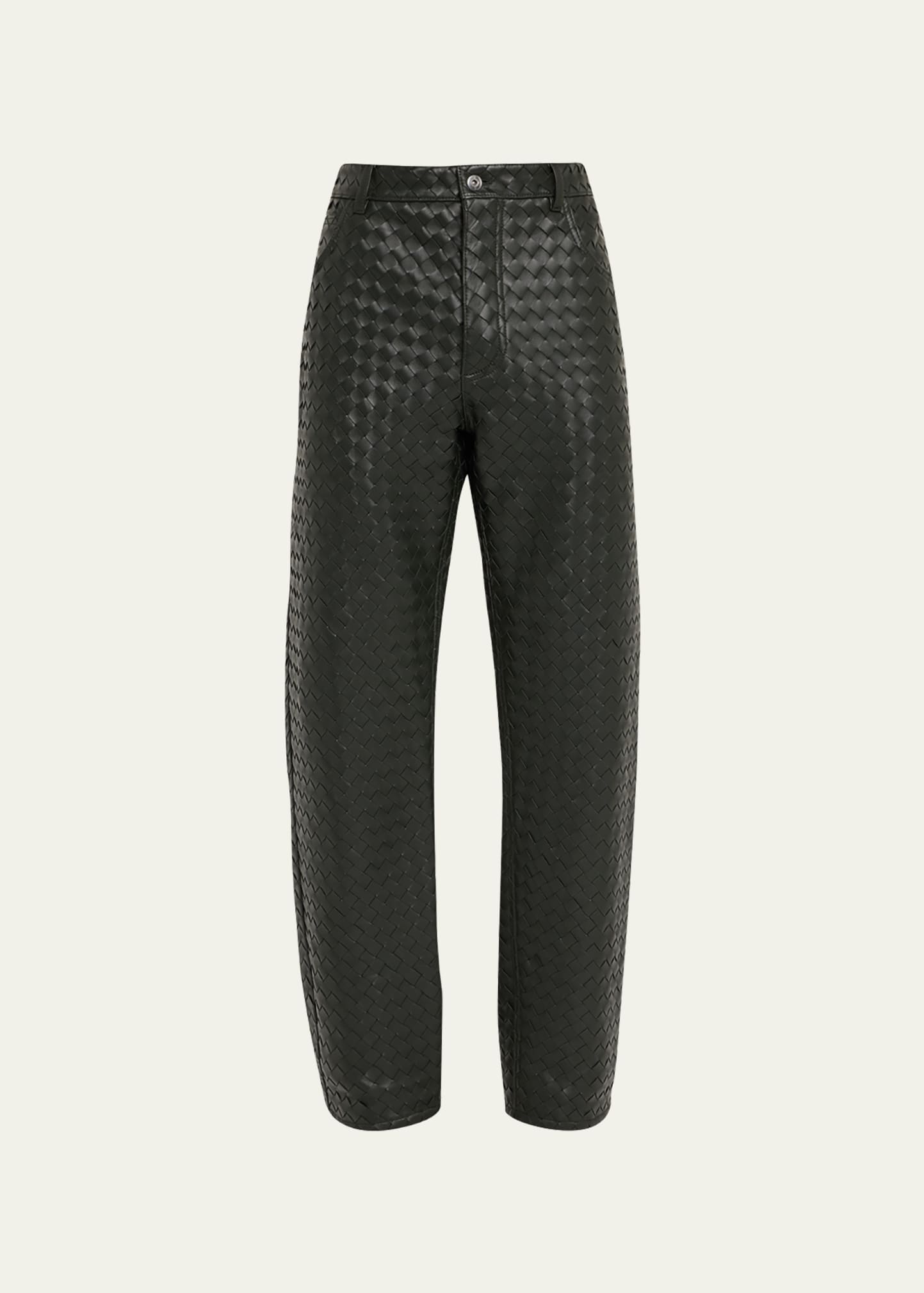 Bottega Veneta pants in signature intrecciato leather Regular rise Front scoop pockets Full length Loose fit Button/zip closure; belt loops Made in Italy