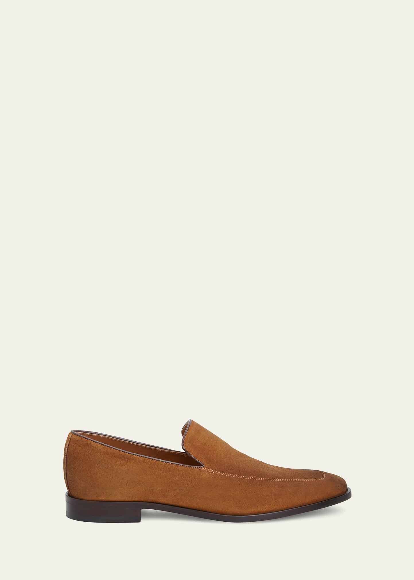 Bruno Magli Collezione "Ivan" contemporary loafers in soft, waxed suede leather with piping at the seams Stacked heel Square toe Notched vamp Rounded outsole Slip-on style Made in Italy