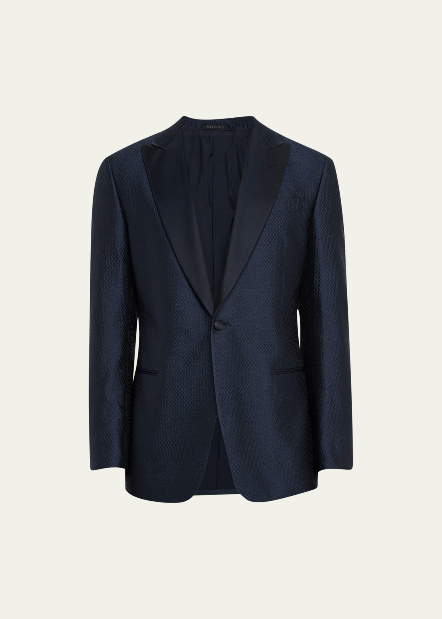 Giorgio Armani dinner jacket in two-tone patterned jacquard Peak lapels; single-button front Chest welt pocket Jetted hip pockets Unfinished sleeves Double-vented back Silk/polyester Lining: Viscose Dry clean Made in Italy