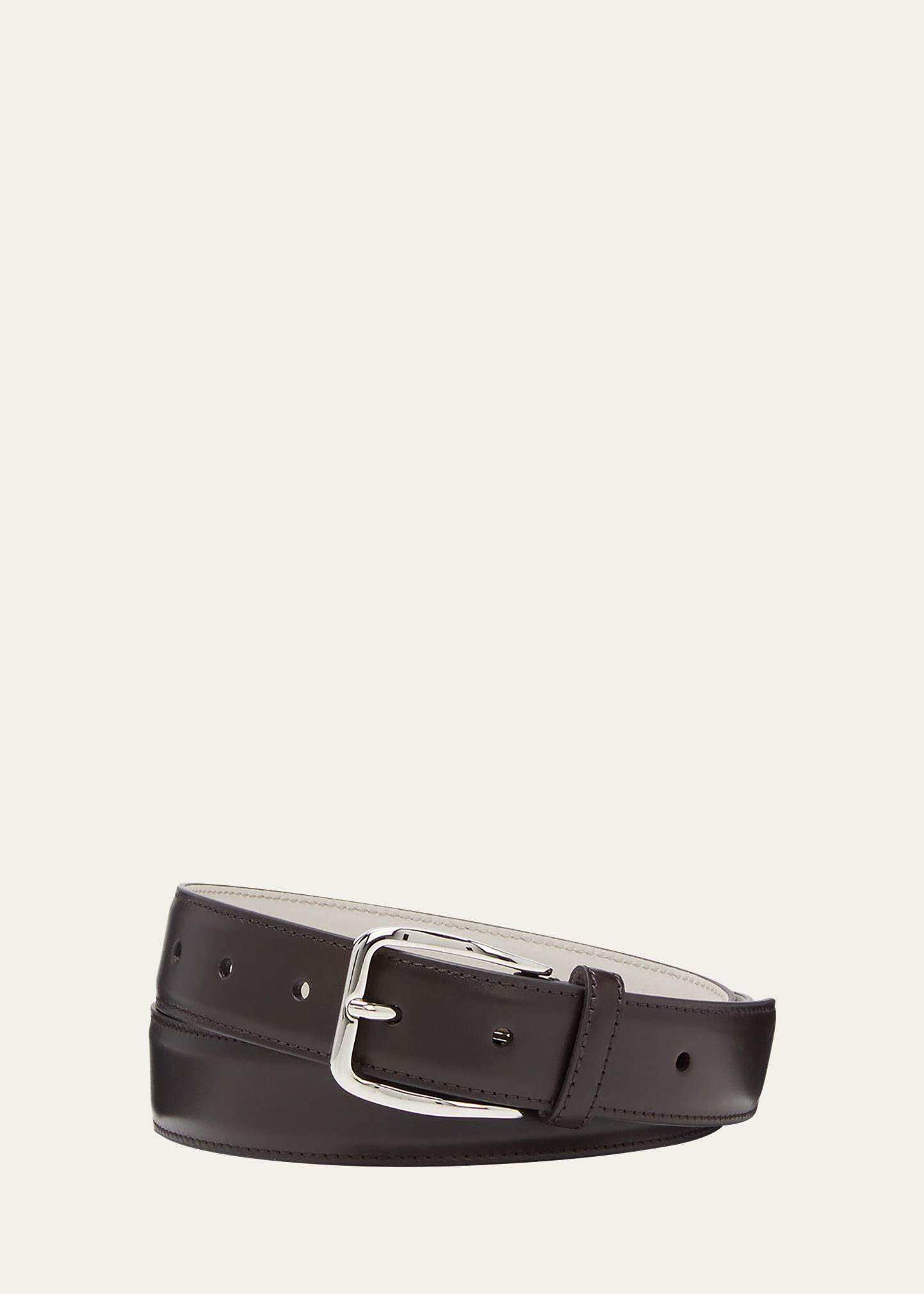Brunello Cucinelli belt with rounded rectangle single-prong buckle Approx. 1"W Polished silvertone hardware Adjustable fit Leather Made in Italy