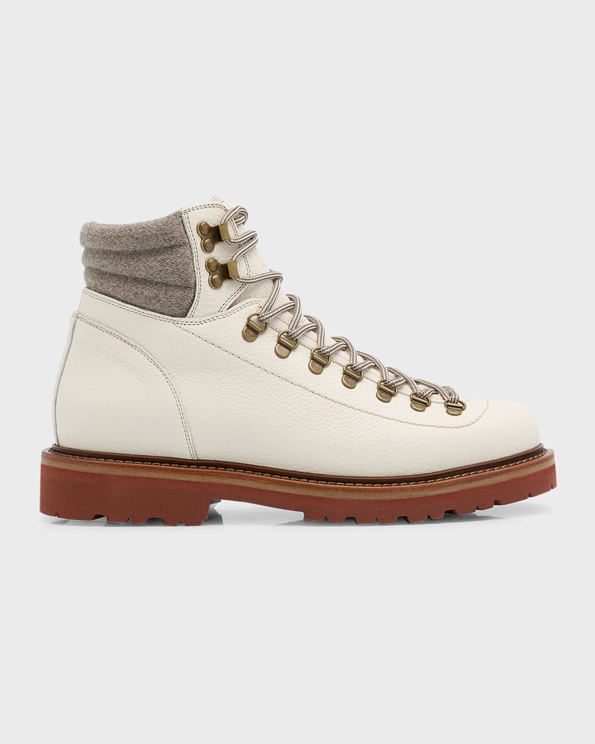 Brunello Cucinelli hiking boots in smooth leather Stacked chunky heel Round toe Lace-up vamp Embossed logo motif at tongue Quilted fabric collar Made in Italy