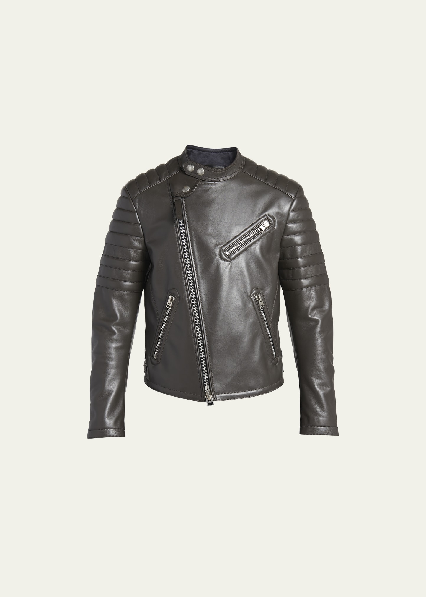 TOM FORD biker jacket in soft leather with quilting along the shoulders and back Biker collar; snap fastening Asymmetrical full-zip front Three front zip pockets Long sleeves Zip cuffs Double buckles on the sides Lining: Cotton/cupro Made in Italy