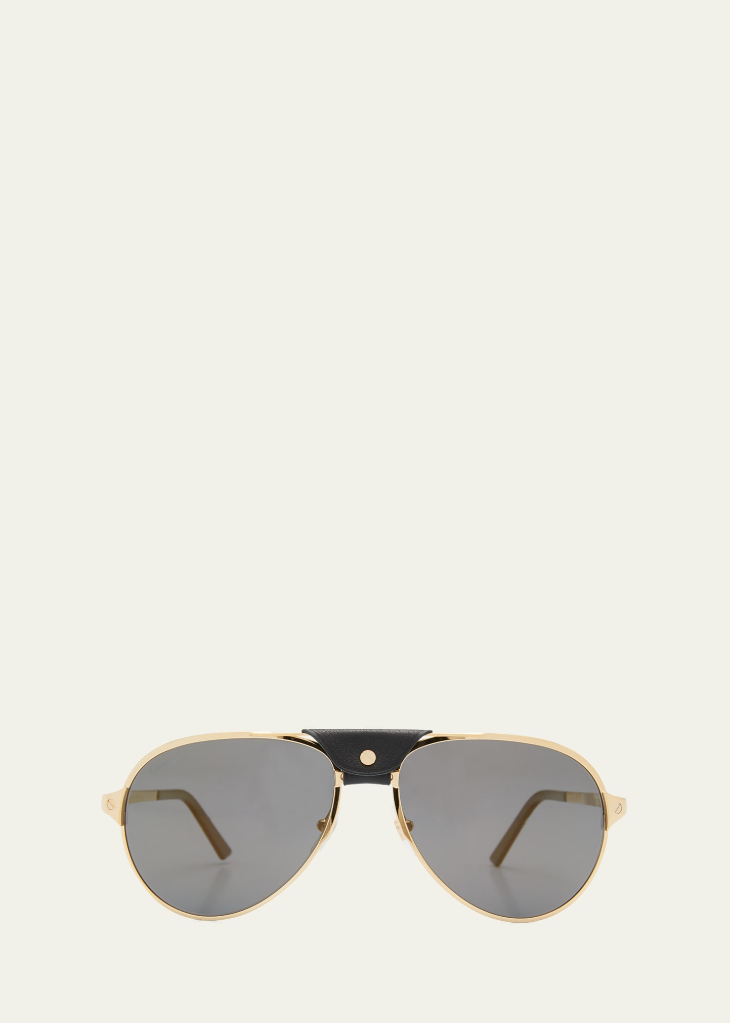 Cartier aviator sunglasses with a leather patch at the nose bridge Solid-color lenses Logo script at right lens Thin, full-rim frames Adjustable nose pads Etched logo script at the temples Thin arms; curved capped temple tips Titanium 100% UVA/UVB protection Made in Japan