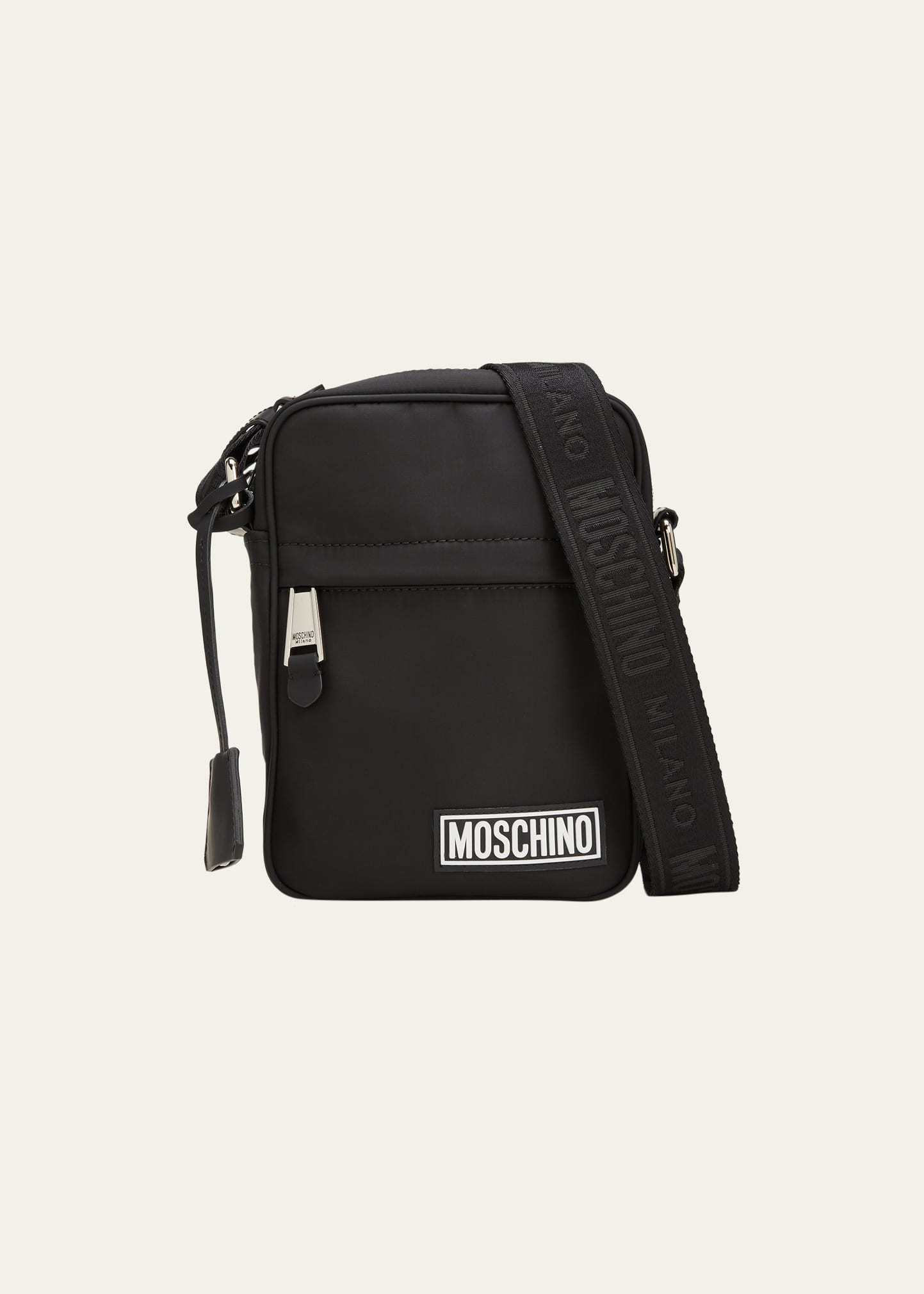 Moschino shoulder bag with printed logo lettering at front Approx. 5.7"W x 1.9"D x 6.9"H Double zip closure Chunky zip pulls Detachable adjustable web shoulder strap; 25.6" drop Hanging clochette Leather trim Polyamide Made in Italy