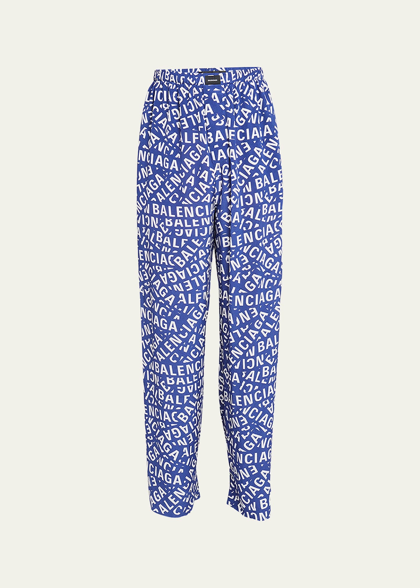 Balenciaga pajama pants featuring an all-over logo printed styling Flat front Regular rise; elastic waistband Side slip pockets Straight legs Full length Silk Lining: Polyester Dry clean Made in Italy