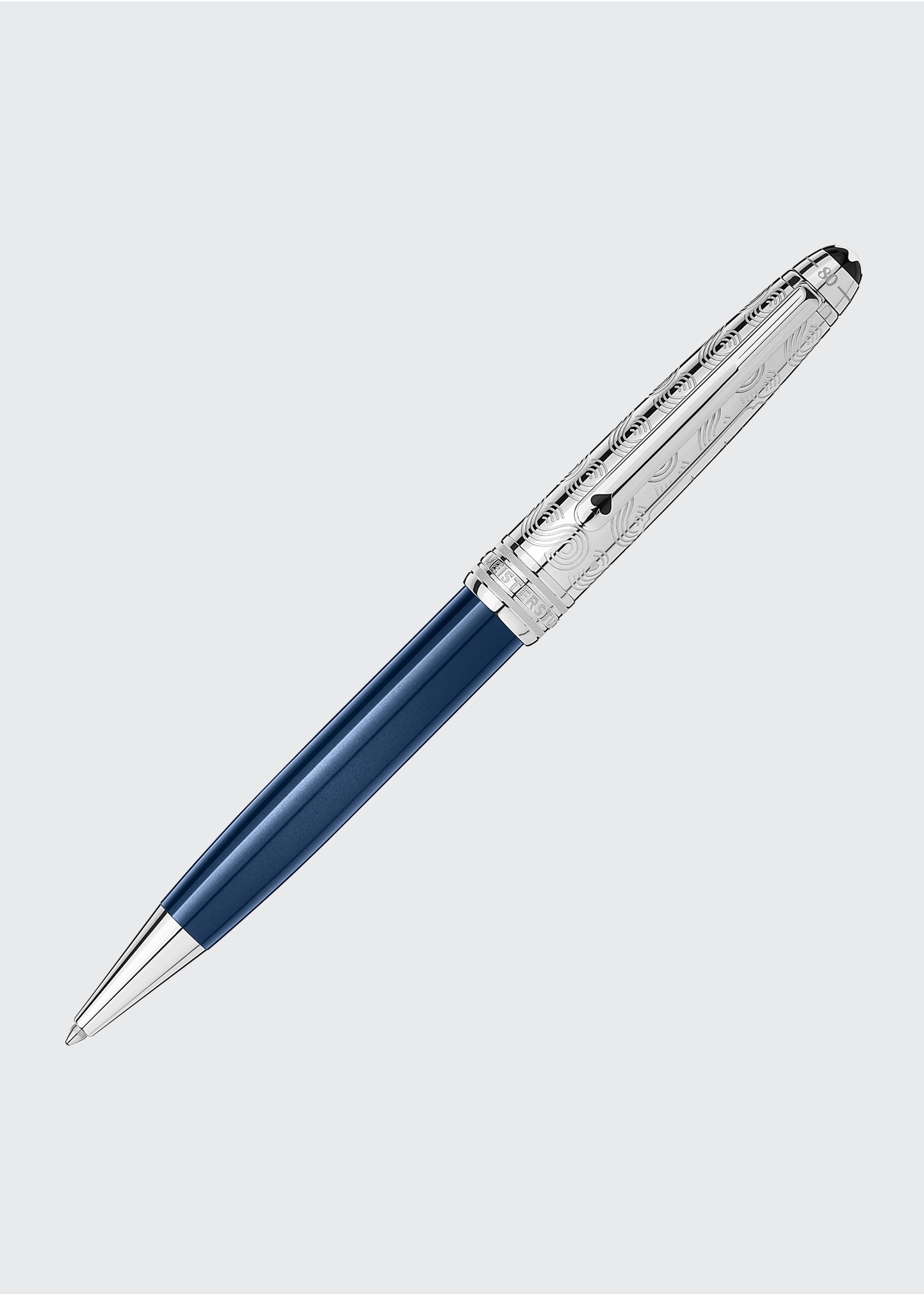 Montblanc midsize ballpoint pen From the Meisterstuck collection Inspired by "Around the World in 80 Days" by Jules Verne Cap features milled pattern of the key elements of the novel: ocean waves, card suits, and a cartouche with a lasered steam boat Cap top embossed with the length of the journey Clip with black lacquer ace of spades symbol Made of precious resin Wipe clean Made in Germany