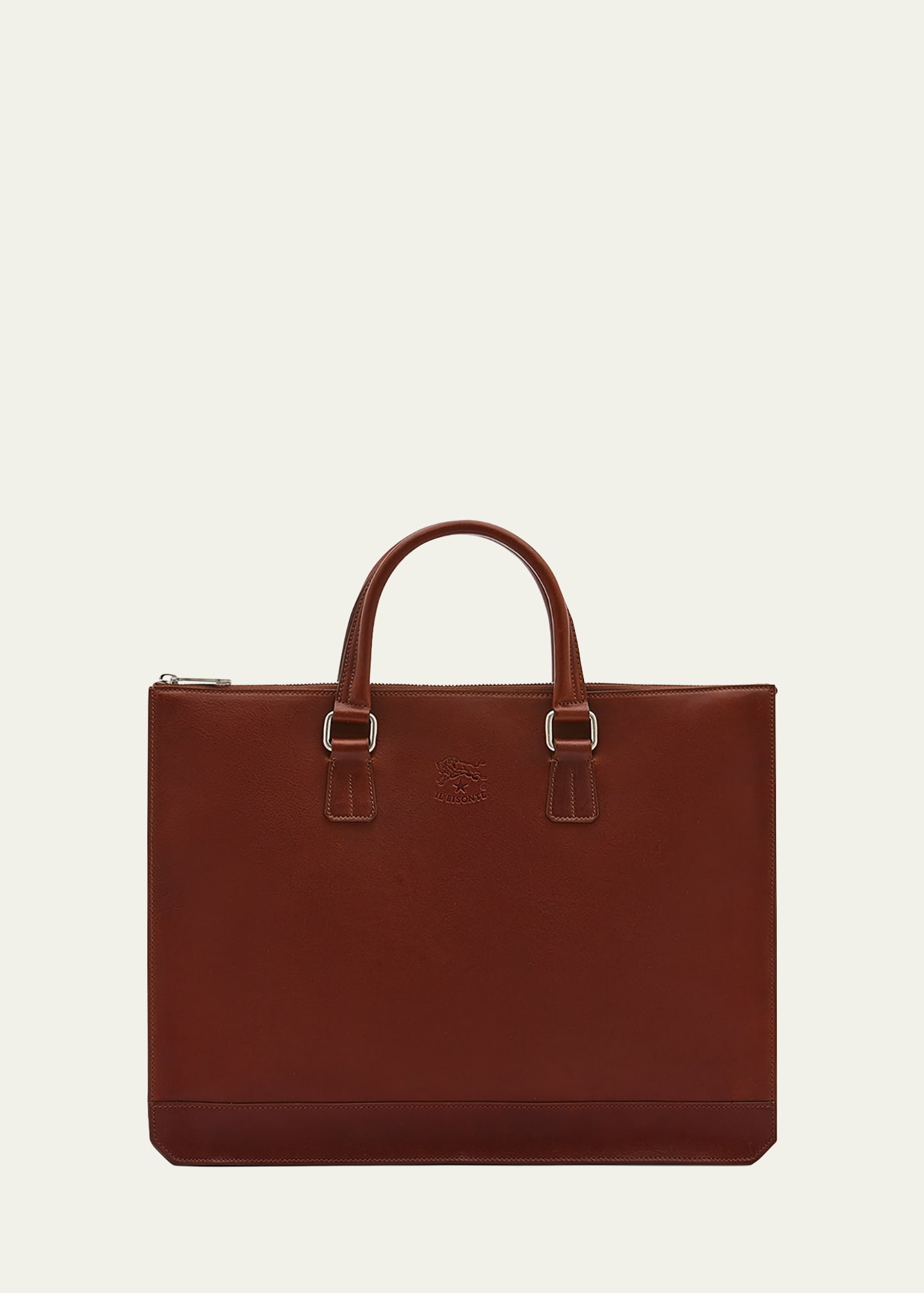 Il Bisonte "Meleto" briefcase bag features tonal debossed logo at front Two rolled top carry handles Zip closure One internal slip pocket Adjustable, removable shoulder strap Cotton canvas lining Vachetta leather Made in Italy