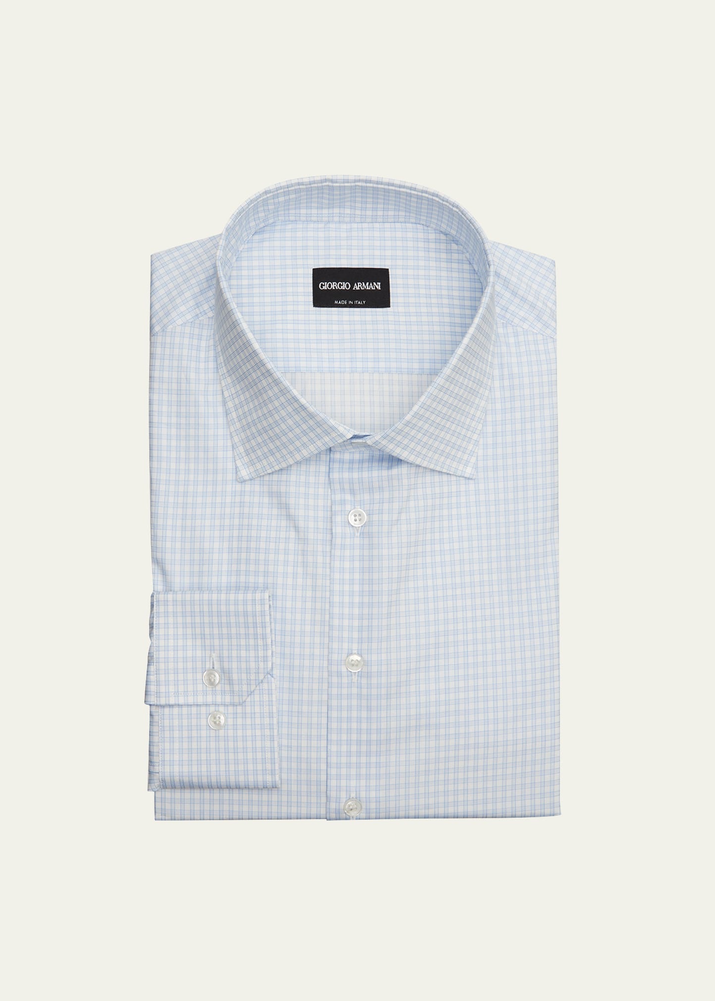 Giorgio Armani dress shirt features a micro-check print Point collar; button placket Long sleeves Mitered barrel cuffs Yoked back shoulders Shirttail hem Classic fit Cotton Made in Italy