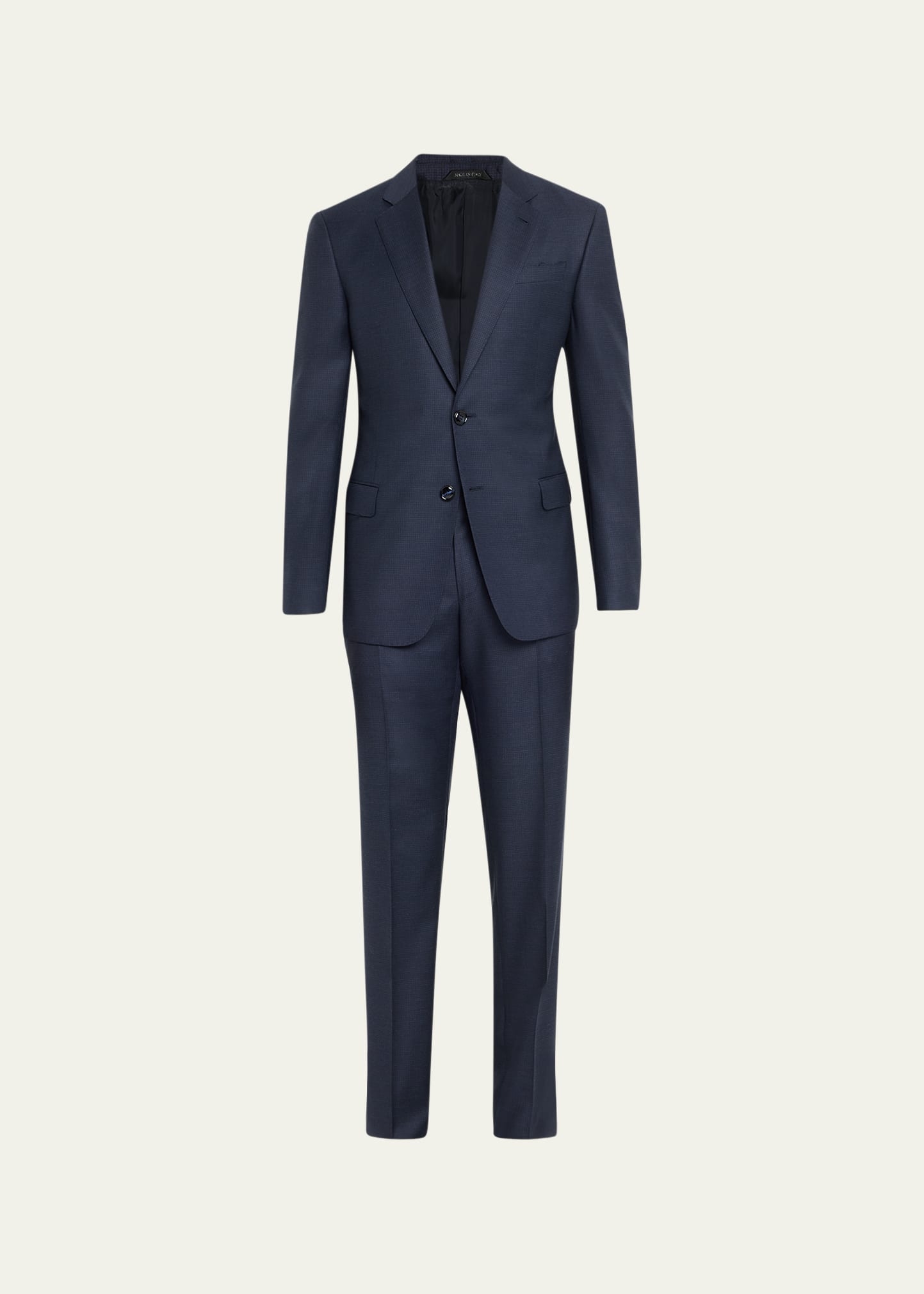 Giorgio Armani mini-check suit from the Soft Line Notched lapels; two-button front Chest welt pocket Hip flap pockets Unfinished sleeves Double-vented back Flat-front trousers Unfinished hem to be tailored to desired length Super 150s virgin wool Lining: Acetate/cupro/viscose Made in Italy
