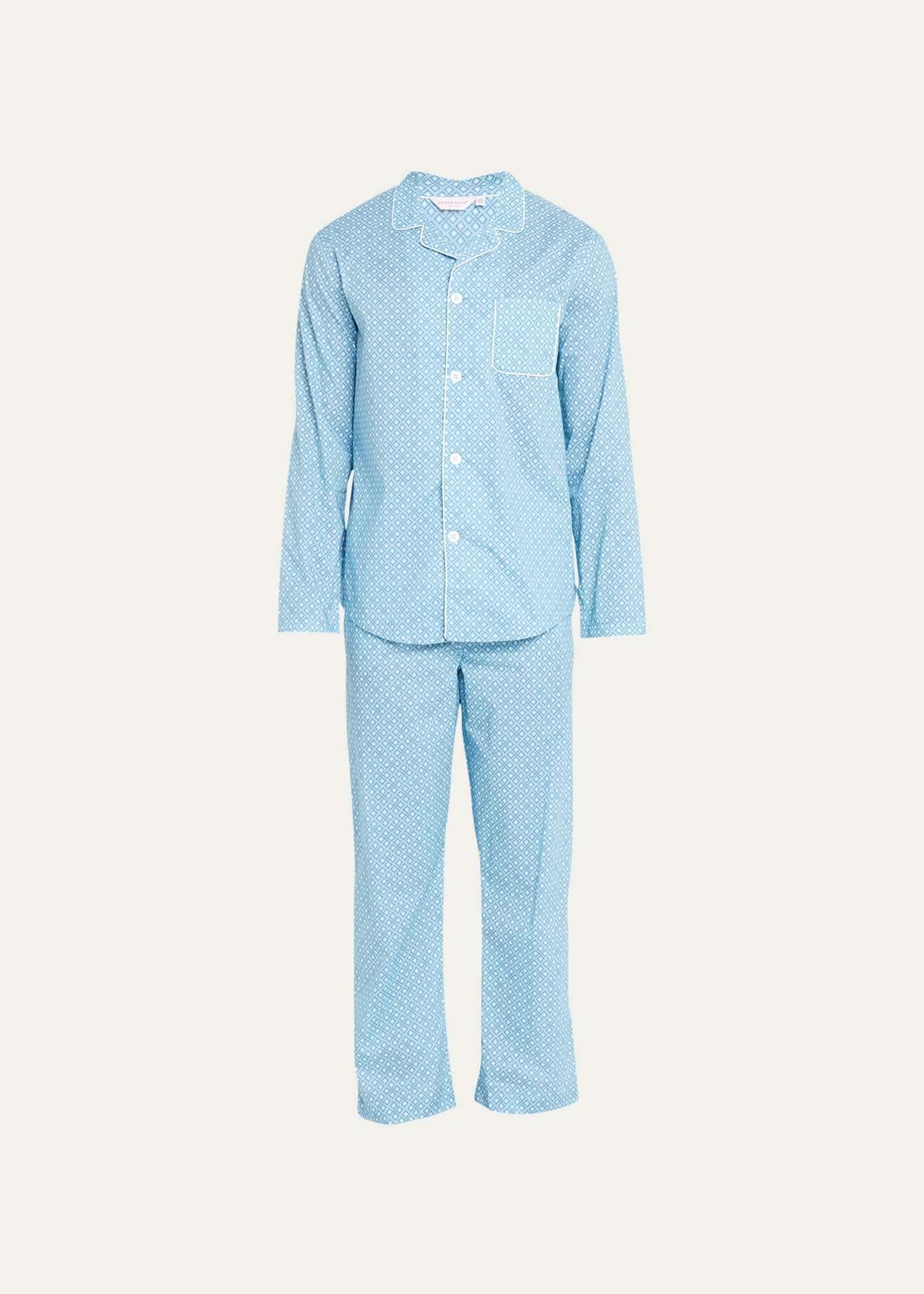 Derek Rose patterned pajama set Notched collar; button placket Chest patch pocket Long sleeve; approx. 26.0"L Elasticized waist Magnetic closure on fly Hip pockets Straight legs Modern fit Cotton Made in Czech Republic