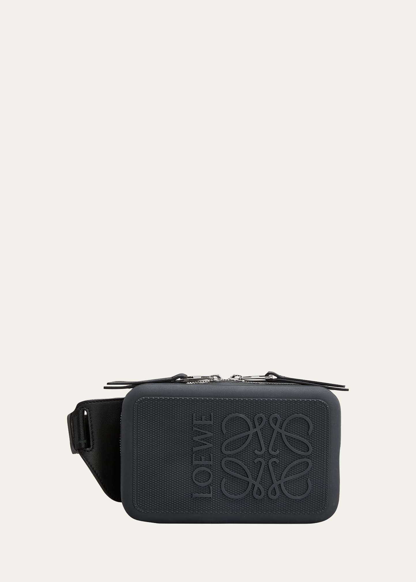Loewe molded sling crossbody bag Approx. 5"L x 3.0"W x 8"H Two-way zip closure Logo webbing shoulder strap Calf leather/thermoplastic technopolymer/polyester Made in Spain