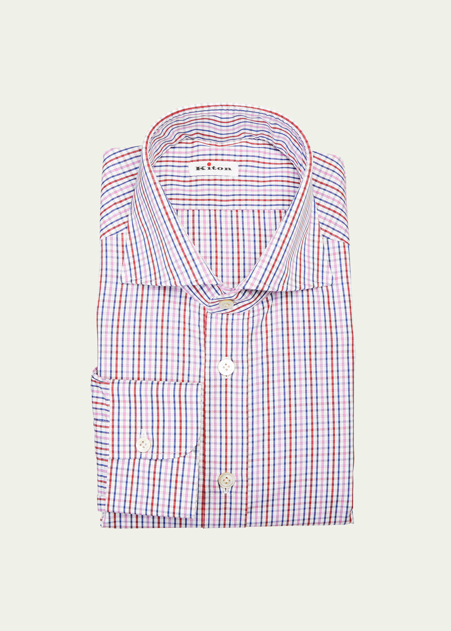 Kiton dress shirt features a two-tone multi-check print Point collar; button placket Long sleeves Round barrel cuffs Yoked back shoulders Shirttail hem Classic fit Cotton Made in Italy