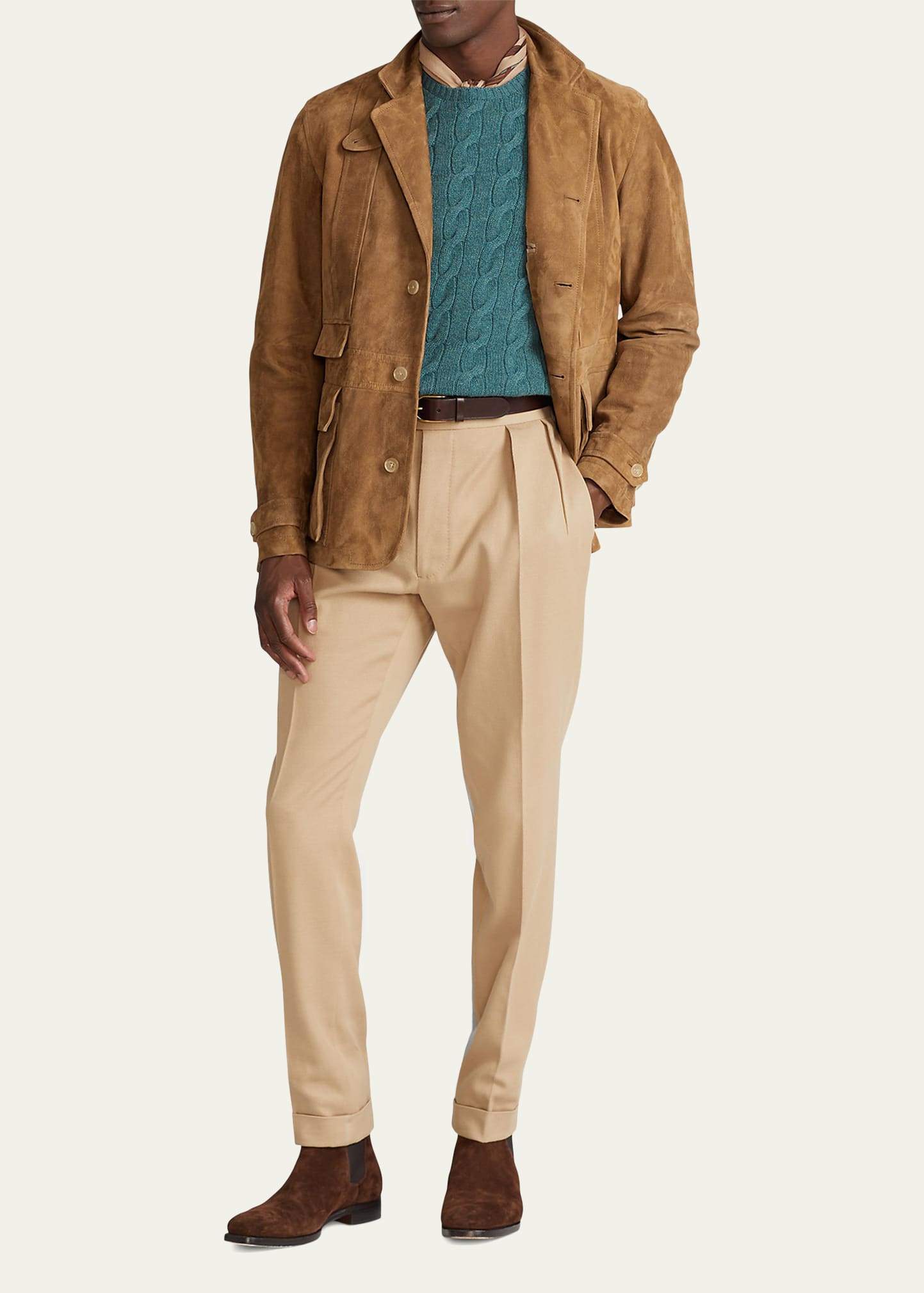 Ralph Lauren Home "Norfork" shirt jacket is crafted from custom-dyed suede with genuine horn buttons Approx. 28"L (size 40R) Notch lapels; throat latch Buttonhole at left lapel Button front Hip flap pockets; ticket pocket Long sleeves Button tabs at cuffs Classic fit Lambskin leather Cupro lining Made in Italy