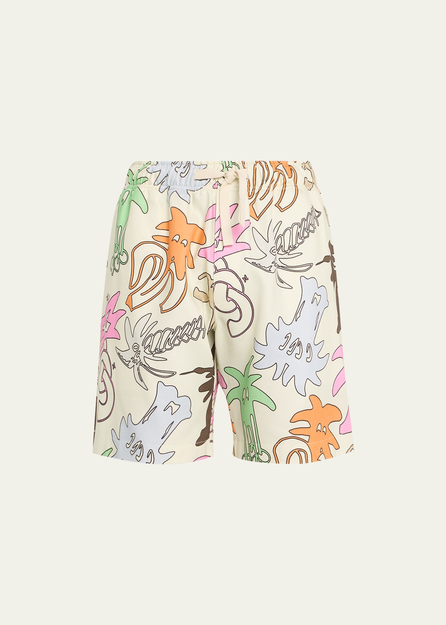 Palm Angels "Palmity" shorts in multicolor graphic print Elasticized drawstring waist Side seam pockets Back patch pocket Relaxed legs Pull-on style Linen/cotton Made in Italy