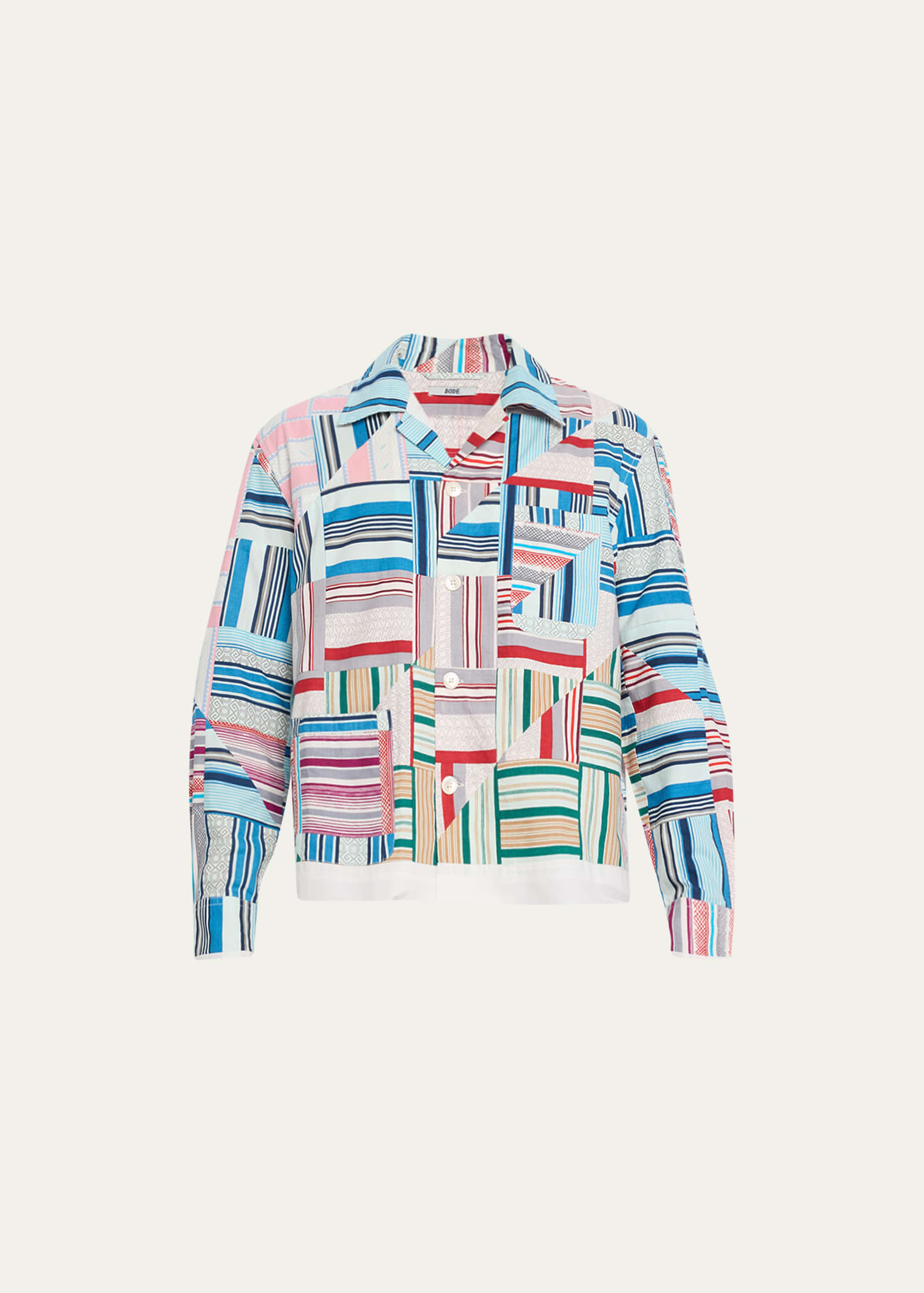 Bode patchwork camp shirt Notched collar; button placket Chest patch pocket Long sleeves Barrel cuffs Yoked back shoulders Straight hem Cotton Imported