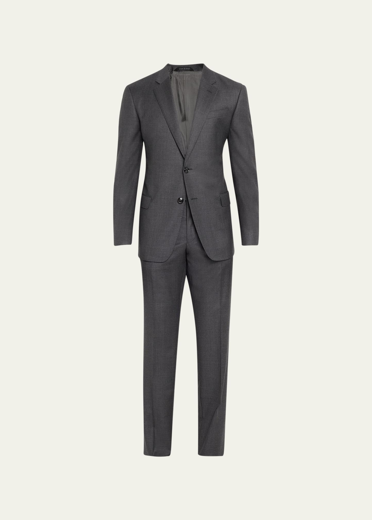 Giorgio Armani plaid suit from the Soft Line Notched lapels; two-button front Chest welt pocket Hip flap pockets Unfinished sleeves Double-vented back Flat-front trousers Unfinished hem to be tailored to desired length Super 150s virgin wool Lining: Acetate/cupro/viscose Made in Italy