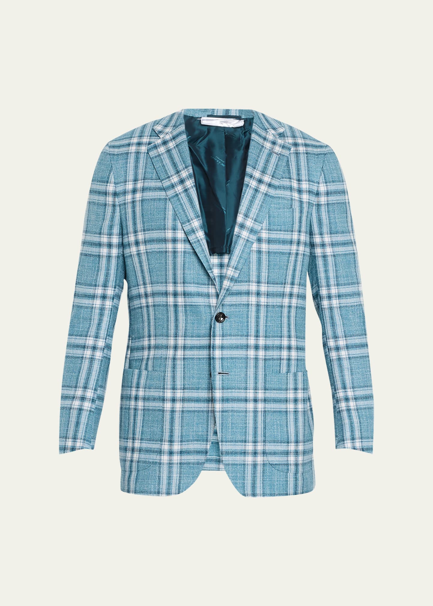Kiton sport coat with a maxi-plaid print Notched lapels Buttonhole at left lapel Chest welt pocket Hip patch pockets Long basted sleeves Double-vented back Virgin wool/silk/linen Dry clean Made in Italy