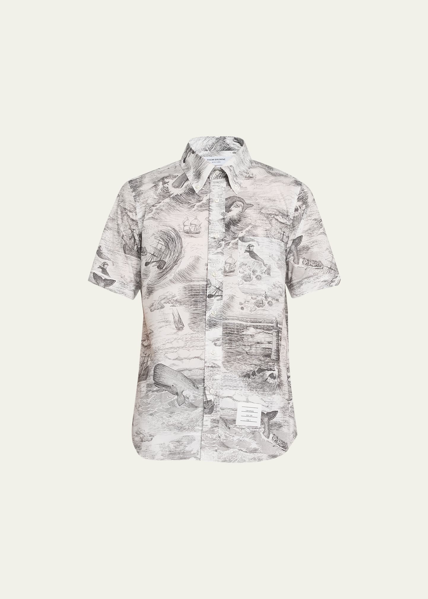 Thom Browne poplin sport shirt with allover nautical toile print Button-down collar and placket Short sleeves Curved hemline Cotton Made in Italy