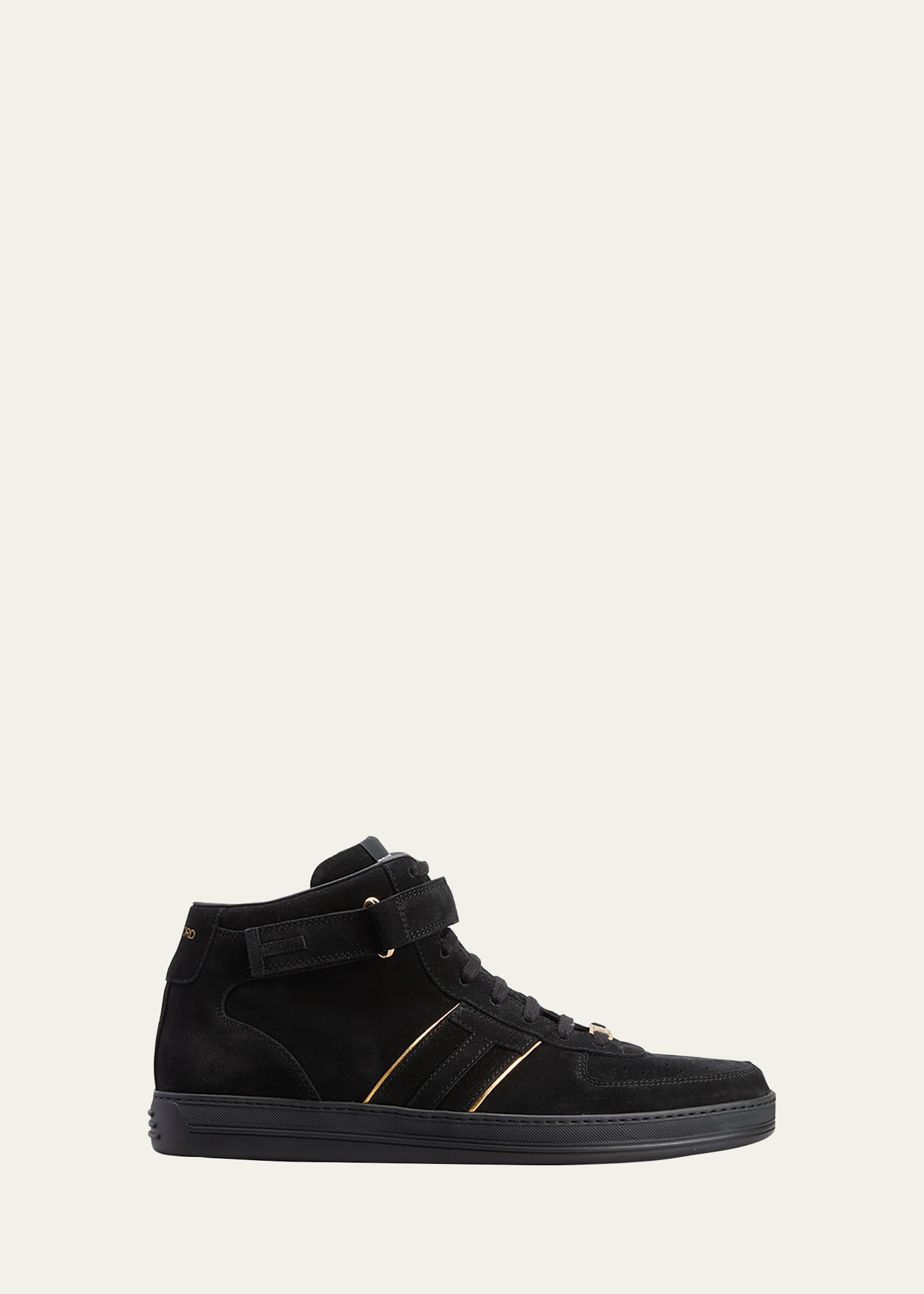 TOM FORD "Radcliffe" high-top sneakers in suede-leather feature gold-tone trim Flat heel Round toe Perforated toe cap Lace-up vamp; gold-tone logo slider Adjustable ankle grip strap Logo patch at tongue Padded collar Foiled gold-tone logo at backstay Tonal T-logo appliqué at the sides Rubber outsole Made in Italy