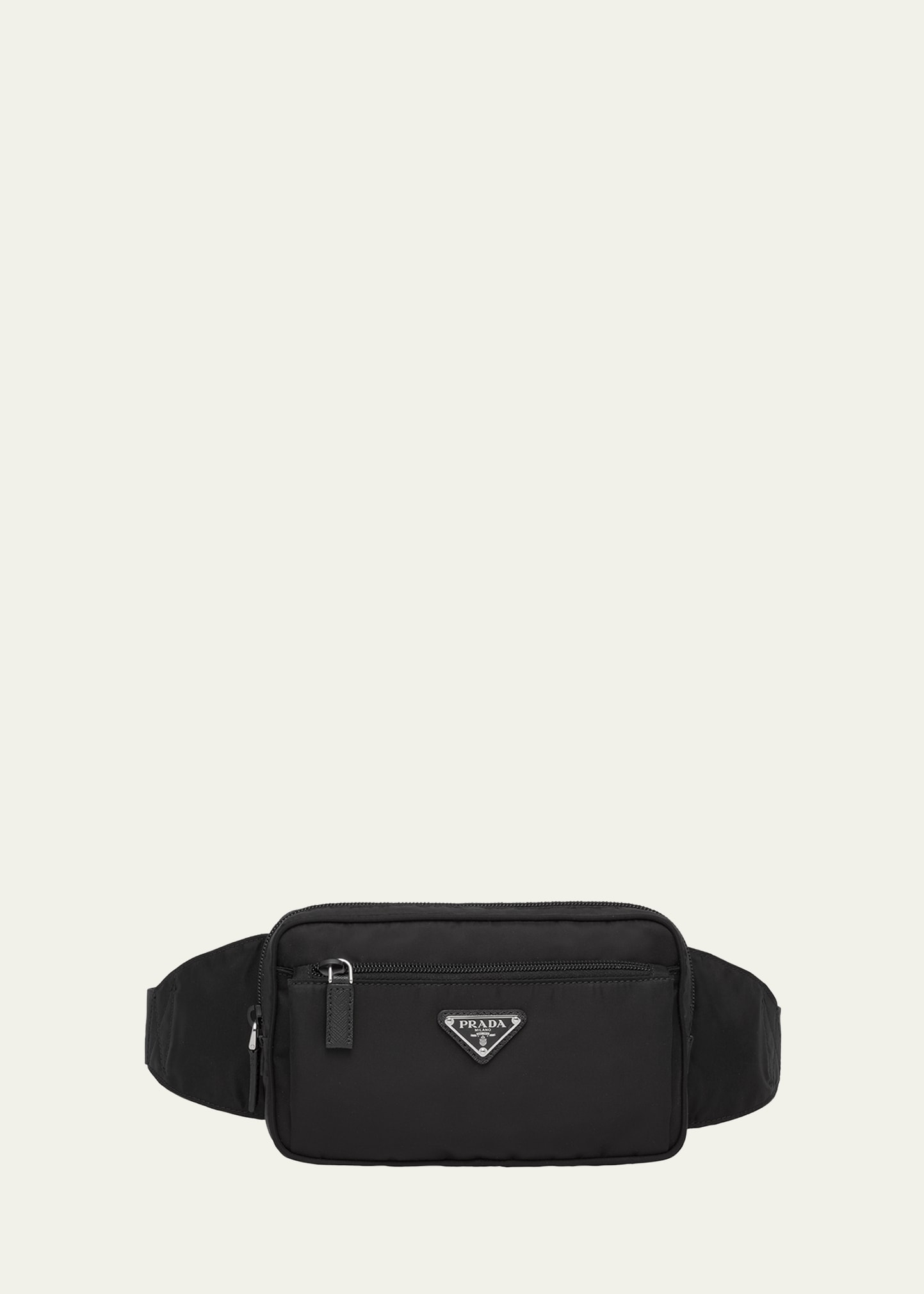 Prada belt bag in recycled re-nylon and Saffiano leather with the iconic enameled triangle logo at front Adjustable strap; side-release buckle Zip closure Exterior, one zip pocket Interior, one zip pocket Approx. 6"H x 7"W Made in Italy