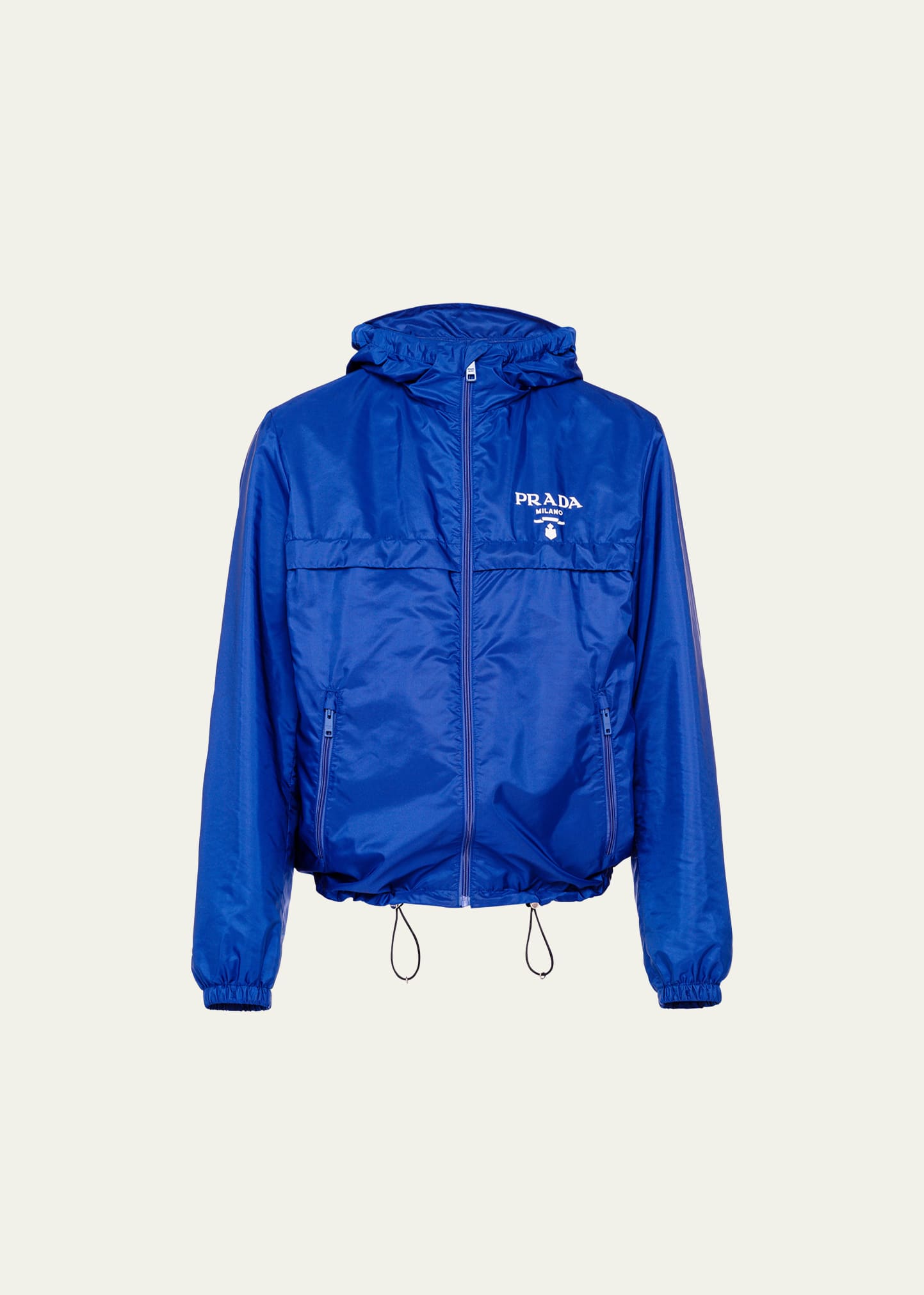 Prada wind-resistant jacket crafted from Re-Nylon, an innovative fabric created through the recycling and purification of plastic Hooded neckline; zip closure Logo print at chest Zip pockets Long sleeves Elasticized cuffs Adjustable drawstring hem Made in Italy