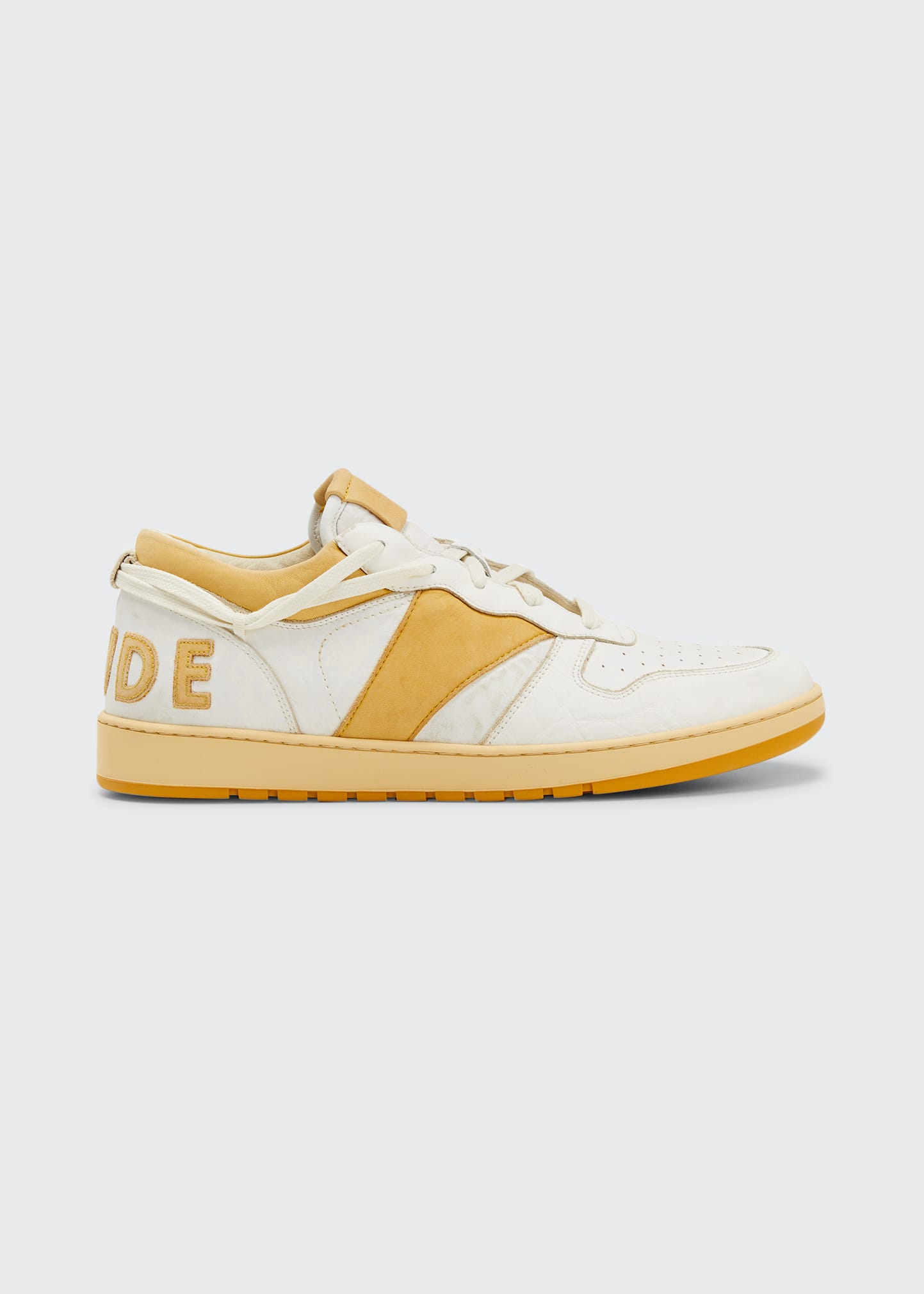 Rhude "Rhecess" low-top sneakers with calf leather upper Flat heel Round toe Perforation at toe cap Lace-up vamp; 360-degree lacing Pigskin lining Logo patch at tongue Logo lettering appliqué at backstay Rubber outsole Made in USA from imported materials