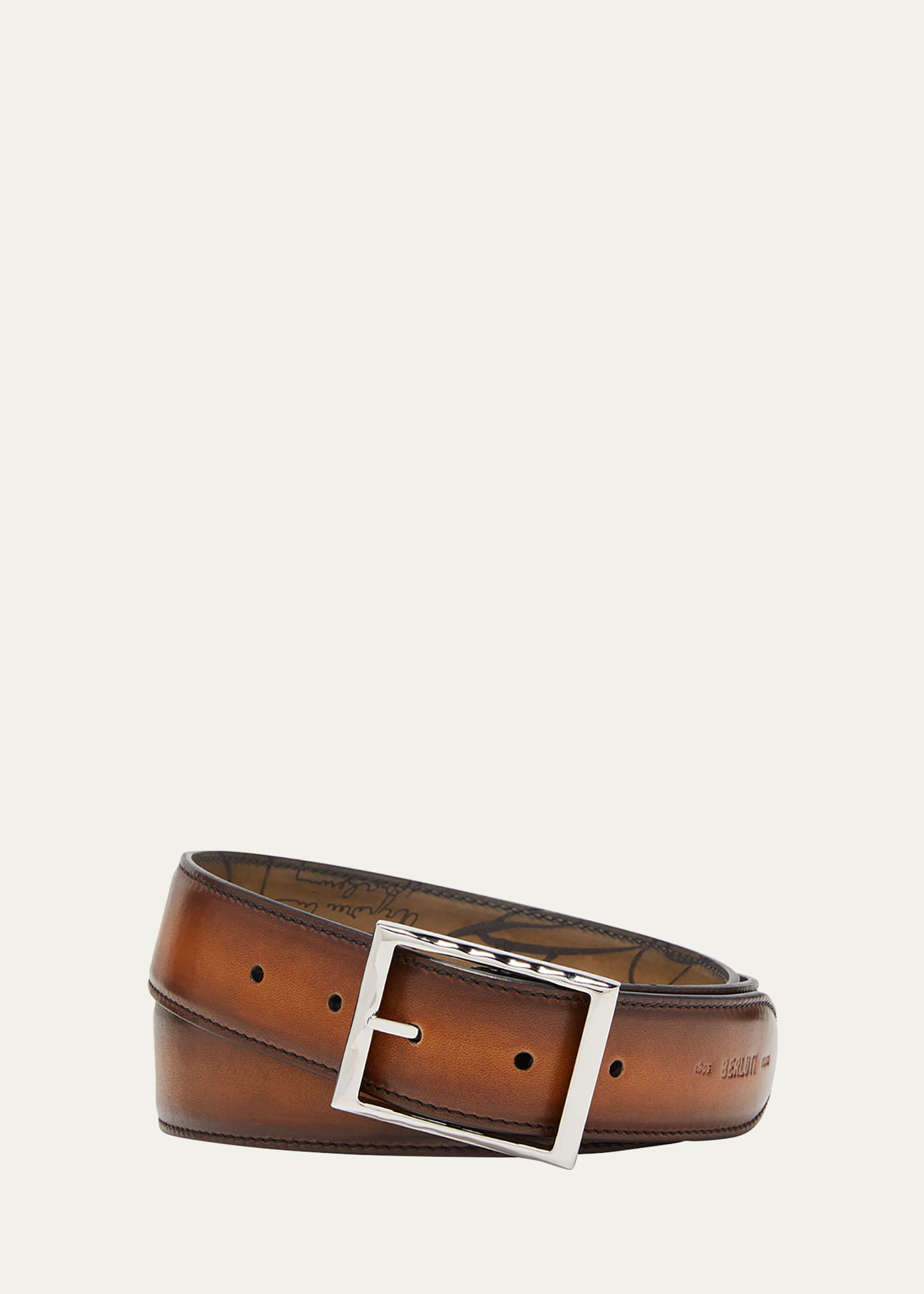 Berluti belt in leather with signature Scritto at the interior Approx. 1.3"W Silvertone rectangular single-prong buckle Debossed logo lettering Adjustable fit Made in Italy