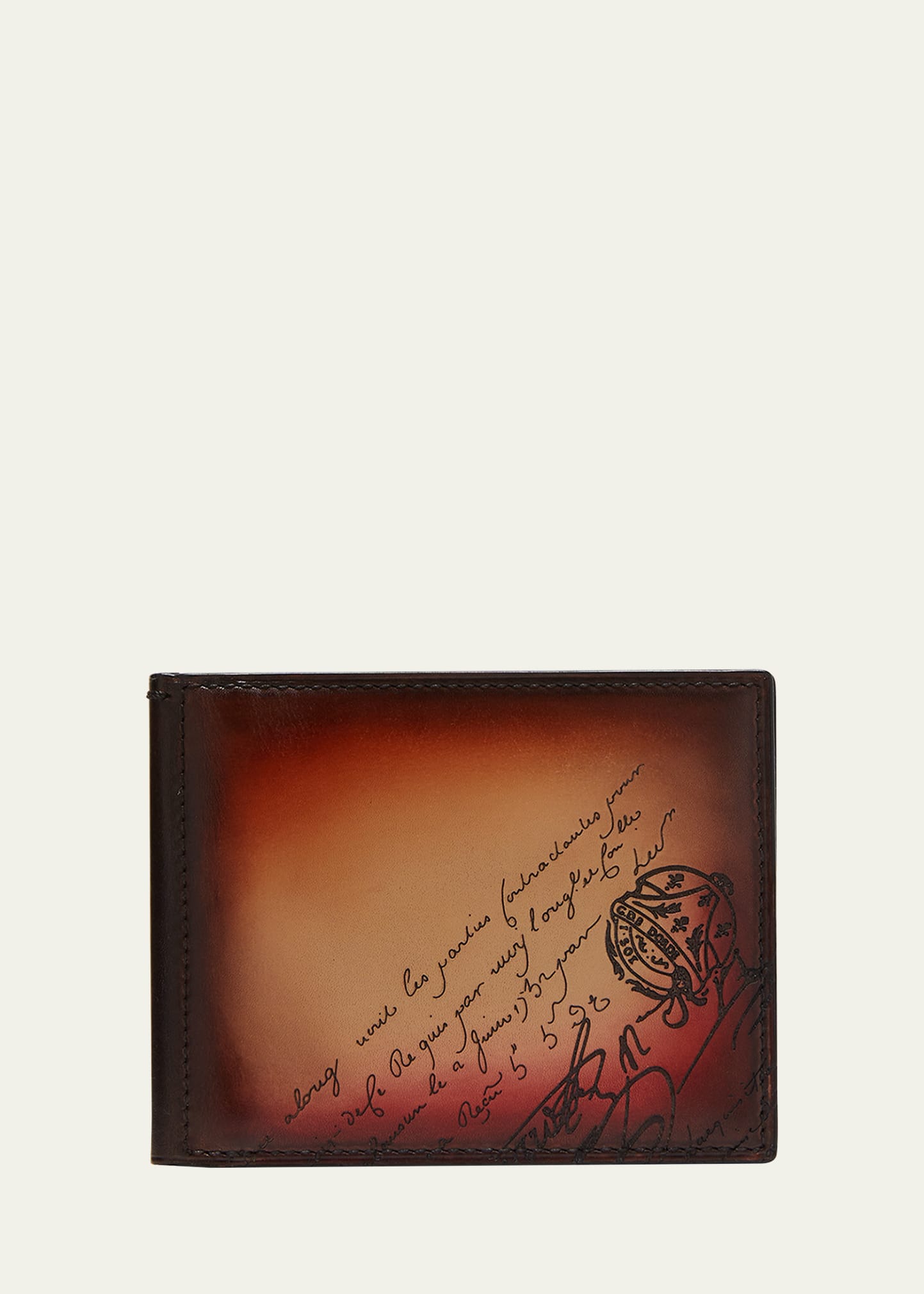 Berluti billfold wallet in leather with signature Scritto Silvertone money clip Six card slots Approx. 4.5"H x 3.5"W Made in Italy