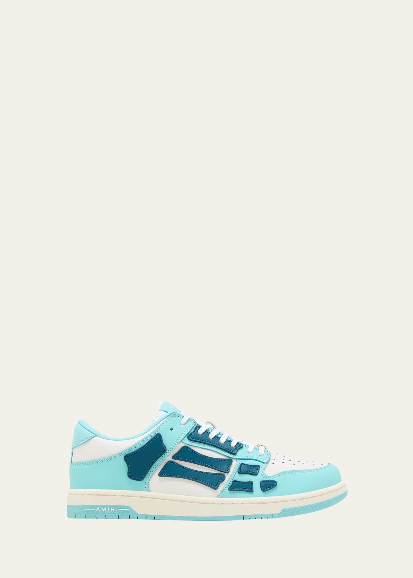 Amiri low-top sneakers in grained leather with denim skeleton appliqués Flat heel Perforated round toe Lace-up vamp; logo slider Logo patch at tongue Padded collar Logo lettering at backstay and midsole Rubber outsole Imported