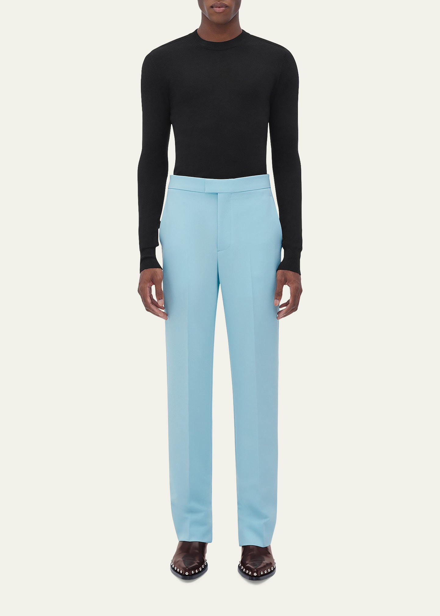 Bottega Veneta solid tuxedo pants High rise Side slip pockets Back welt pocket Full length Straight legs Wool Made in Italy