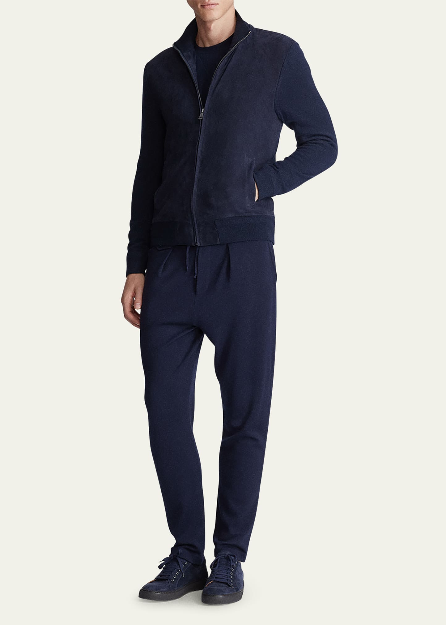Ralph Lauren Purple Label sweater crafted from premium 12 gauge Italian merino wool and cashmere blend fabric Features lightweight suede panel at front and back shoulders Ribbed mock neck Full-zip front Side slip pockets Long sleeves Ribbed cuffs and hem Classic fit Merino wool/cashmere/lambskin leather Made in Italy