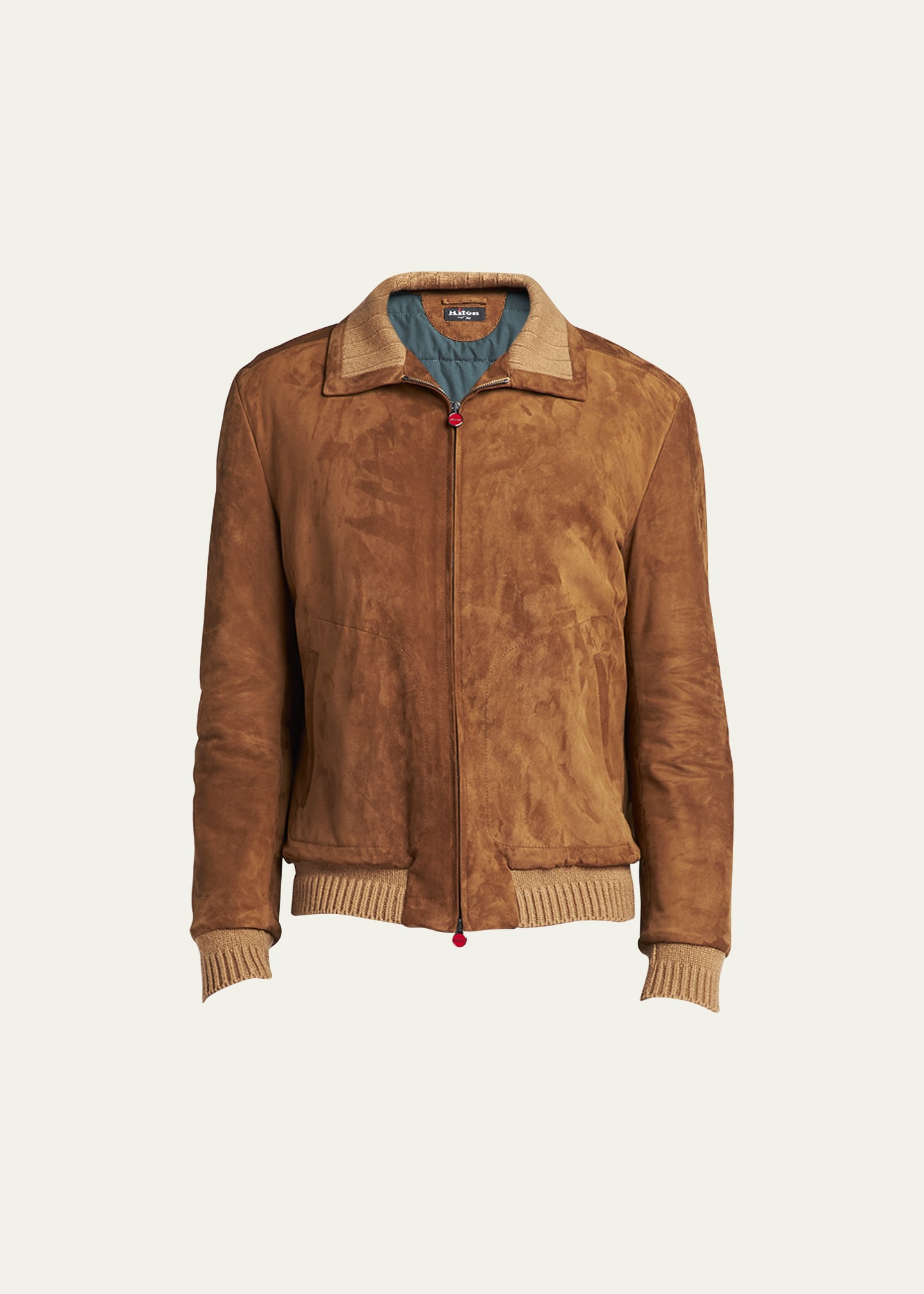 Kiton suede bomber jacket featuring contrast ribbed cuffs and hem Point collar Long sleeves Welt pockets Relaxed fit Two-way zip front Leather Made in Italy