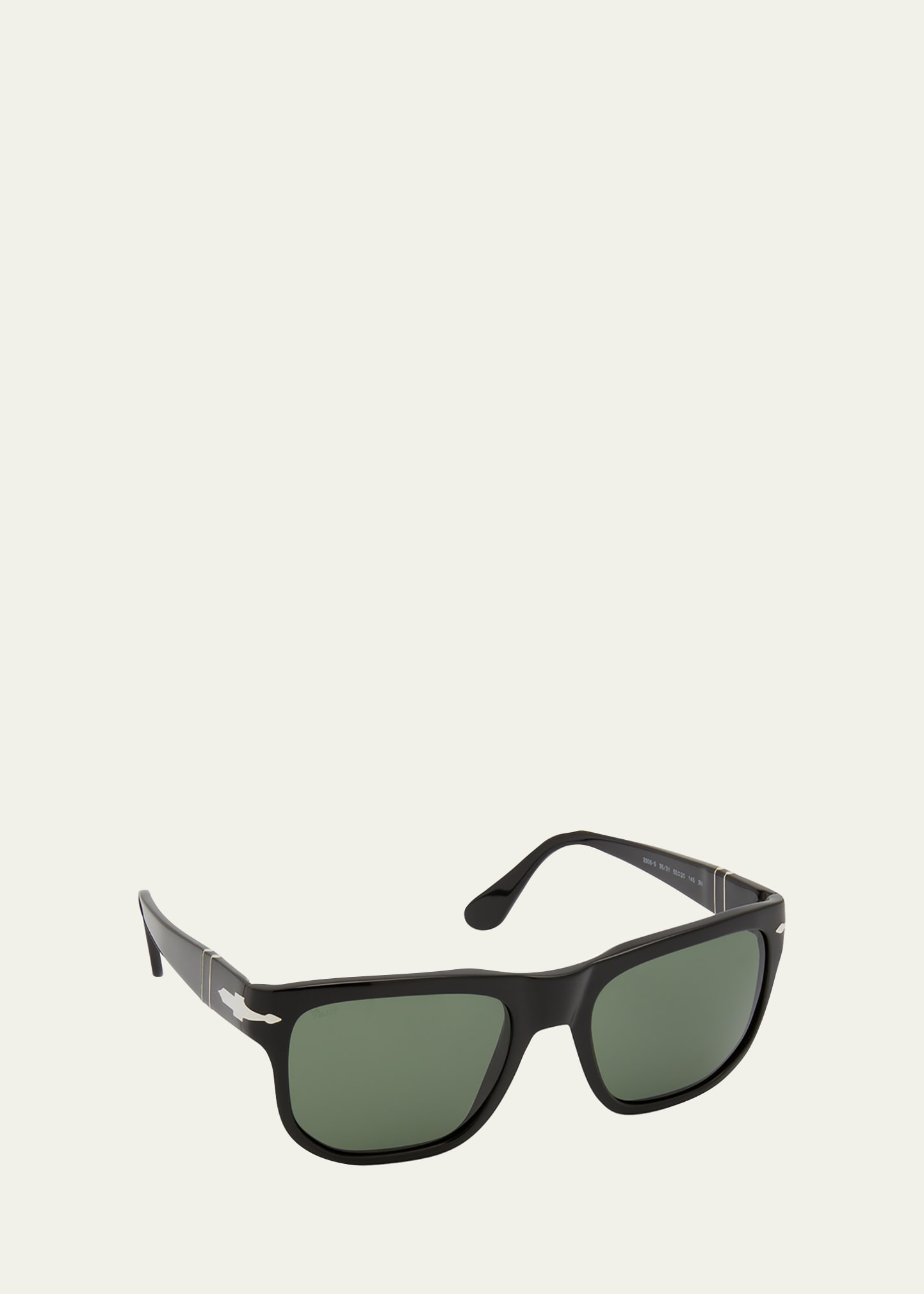 Persol rectangle sunglasses feature signature inlaid logo plaqués at temples Eye/bridge/temple (in mm): 55-20-145 Solid color lenses Full-rim frames Saddle nose bridge Tapered arms; curved temple tips Acetate 100% UVA/UVB protection Made in Italy
