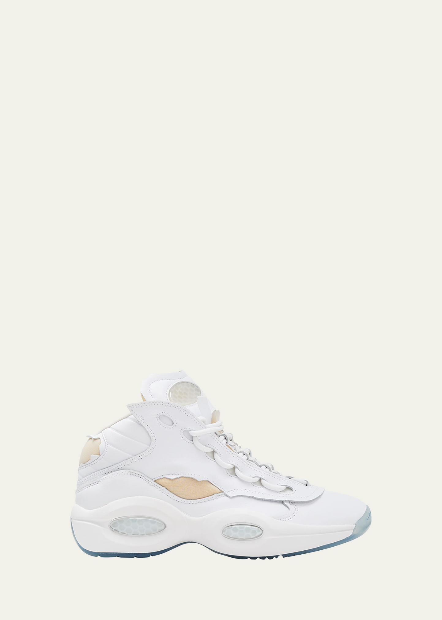 Maison Margiela "The Question" high-top sneakers with calf leather upper Features Décortiqué technique to reveal layer of structural foam underneath Flat chunky heel Reinforced round toe Lace-up vamp Honeycomb inlay at tongue and midsole Padded crown Rubber outsole Made in Italy