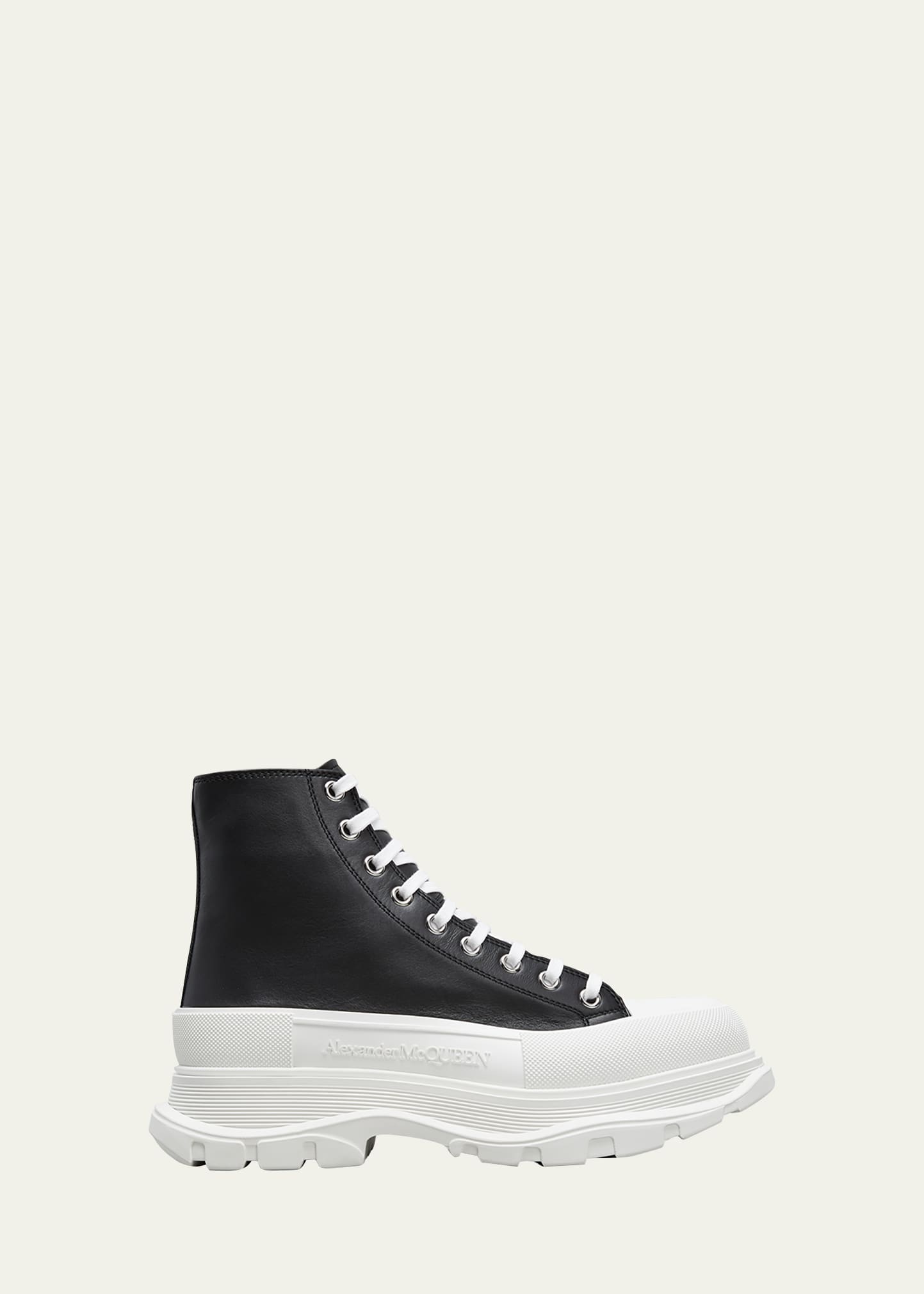 Alexander Mc Queen "Tread Slick" boot in leather. Platform heel; exaggerated midsole. Round cap toe. Lace-up vamp. Logo print at backstay. Rubber sole. Made in Italy.