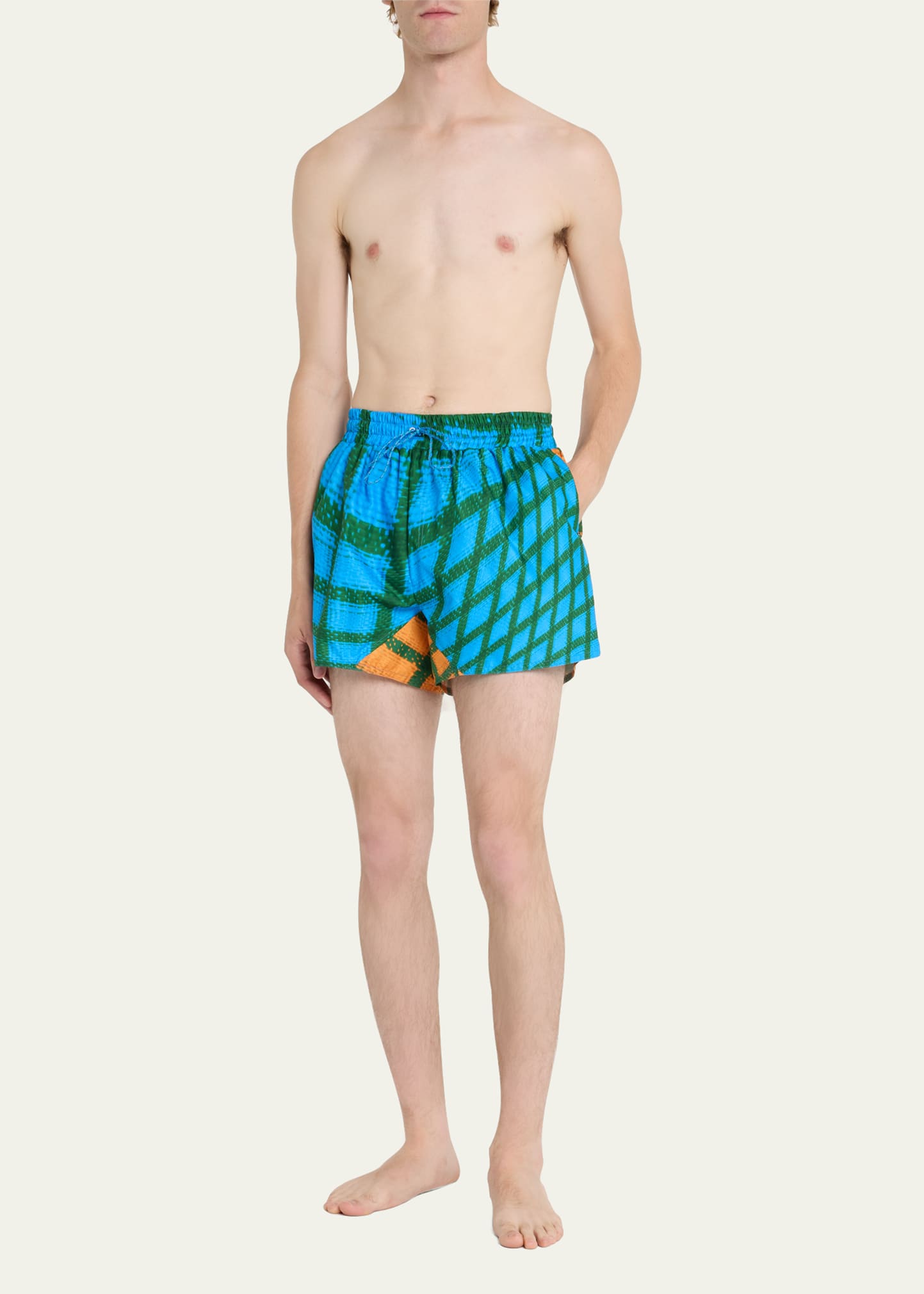 BIANCA SAUNDERS swim shorts in colorblocked twisted tile print Elasticized drawstring waist Side slip pockets Relaxed legs Pull-on style Polyester Made in Italy