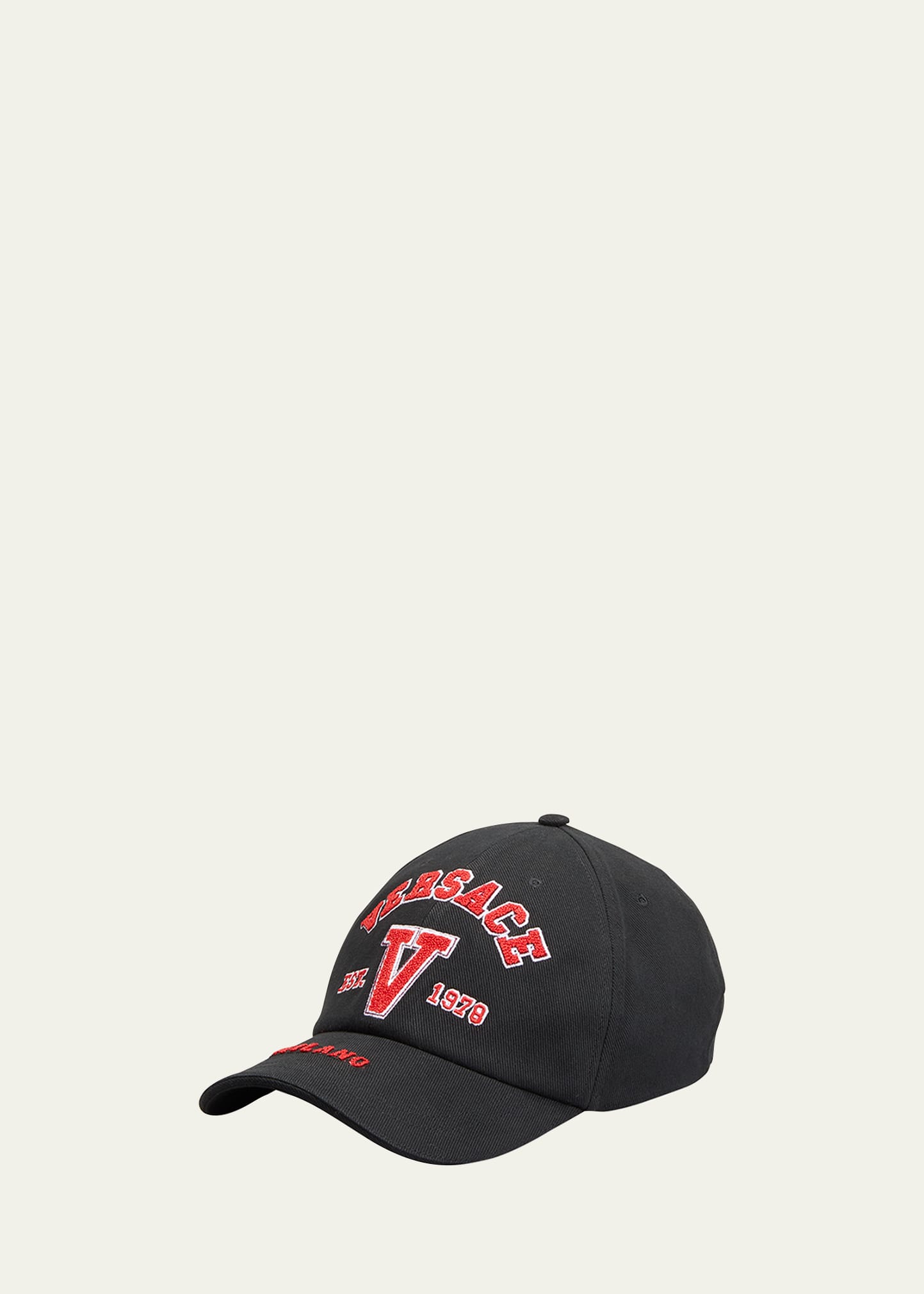 Versace baseball hat features a varsity logo appliqué motif at front Top button at crown Six-panel construction Embroidered eyelets Curved stitched brim Adjustable strap at back with embossed Medusa Head Cotton Do not iron, professional cleaning recommended Made in Italy