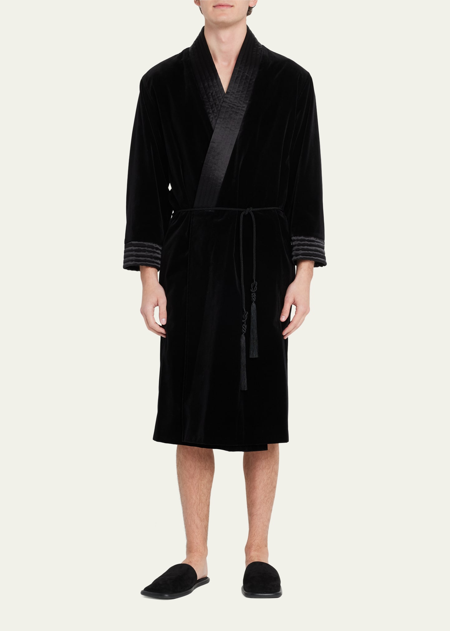Saint Laurent velvet robe with quilted trim Shawl collar; wrap front Cord belt with tassels Side slip pockets Long sleeves Relaxed fit Cotton/viscose/polyester Dry clean Made in Italy