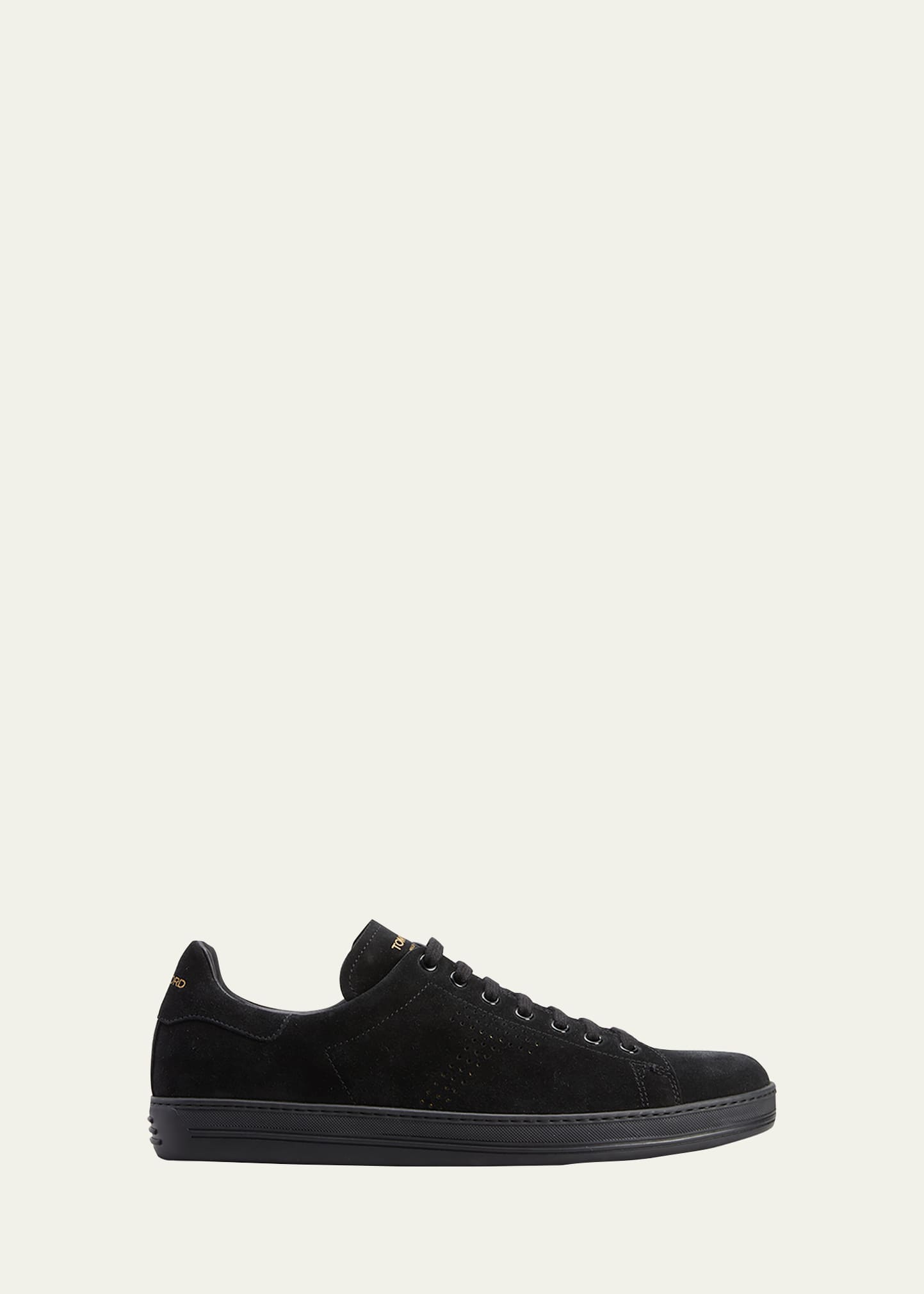 TOM FORD "Warwick" low-top sneakers with suede-leather upper Flat heel Round toe Lace-up vamp Gold-tone foiled logo lettering at tongue and backstay Padded collar Perforated T-Logo at sides Rubber outsole Made in Italy