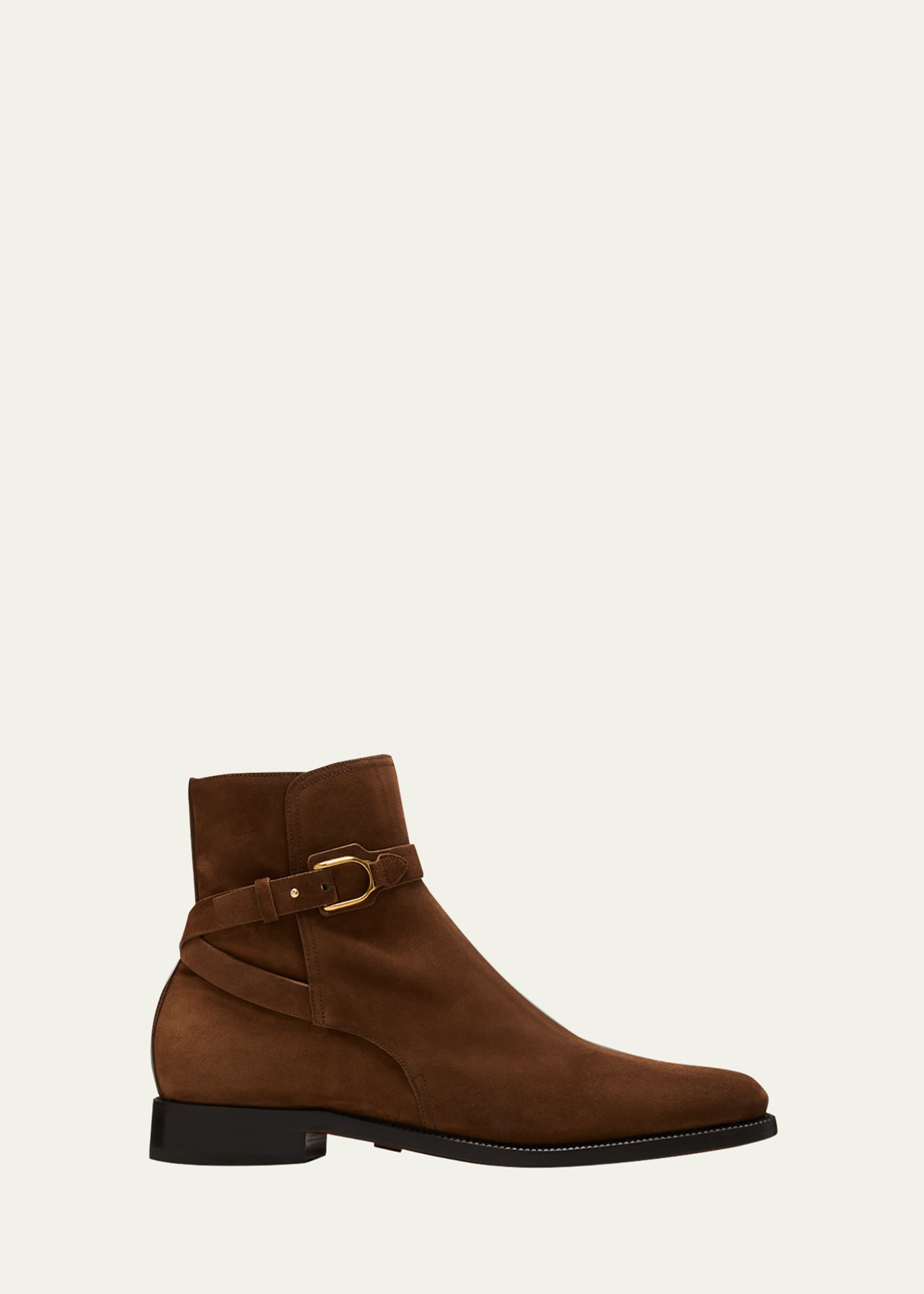 Ralph Lauren Home "Wellington" mid boots with supple calf leather suede upper Features ankle strap accented with stirrup-inspired brass hardware Stacked heel Almond toe Pull-on style Made in Italy